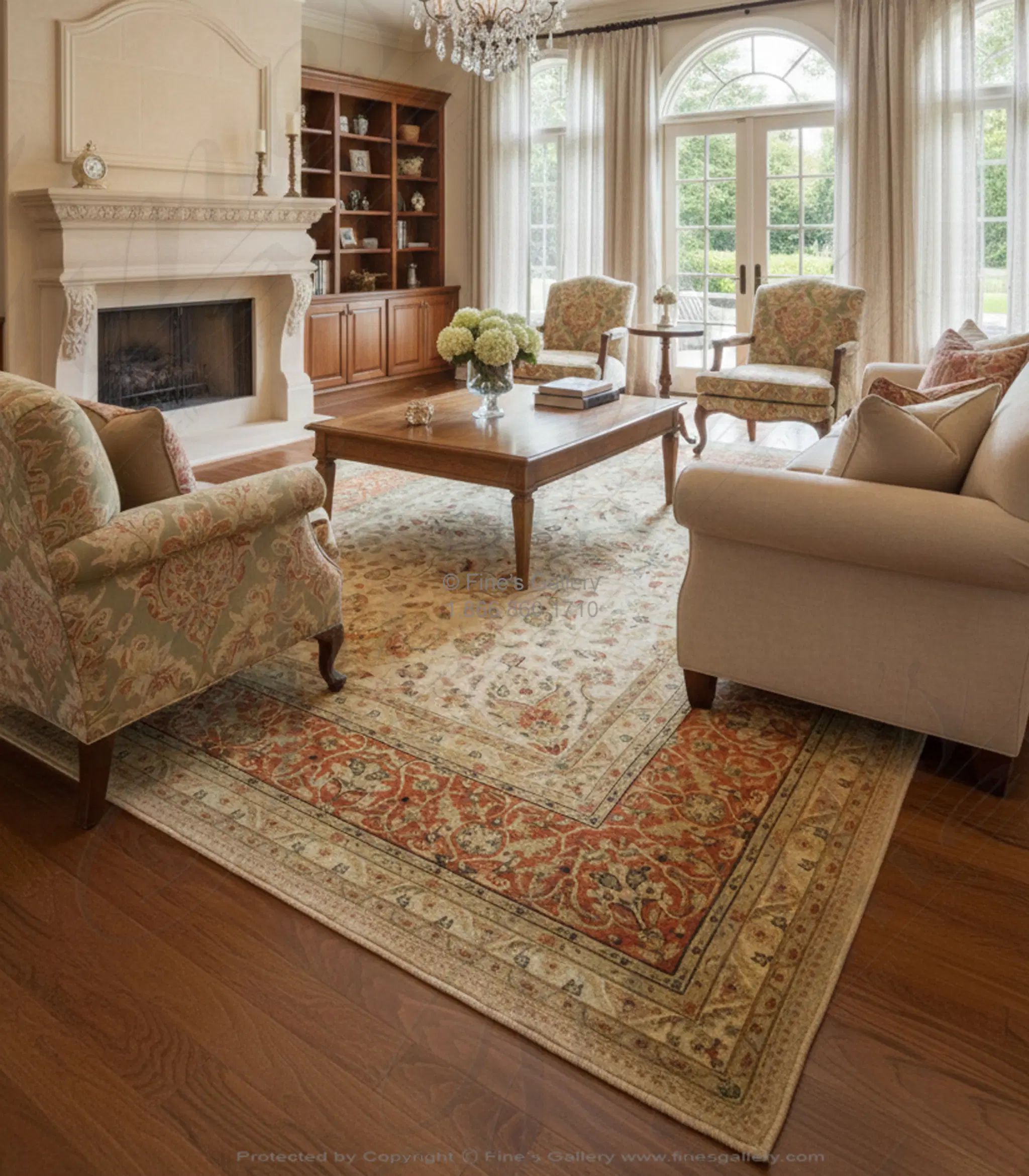 Hand Knotted Wool Traditional Rectangle Rug - Cream and Rust with Earth Tones - R7115