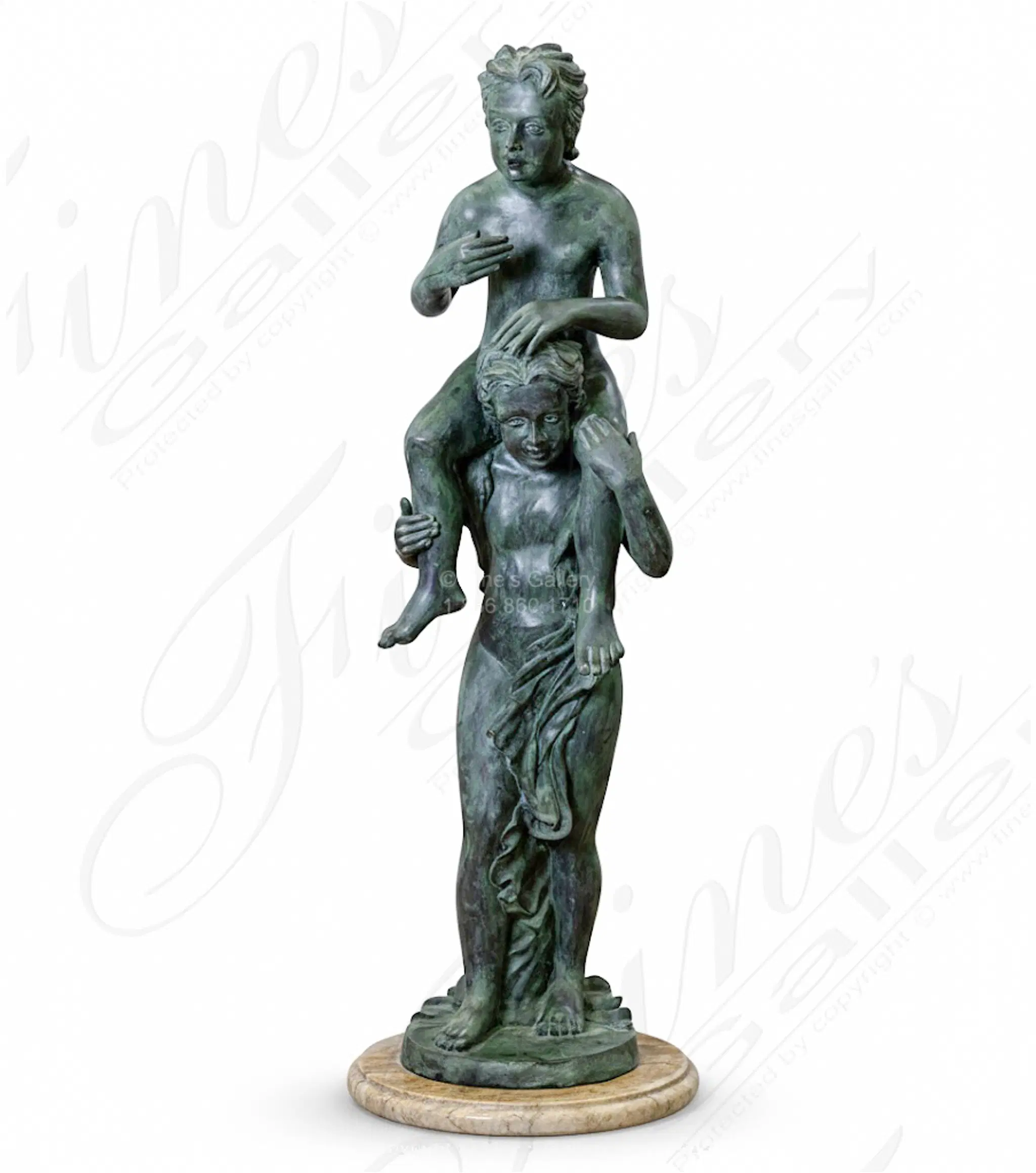 This is a beautiful bronze Fountain of two children playing. This unique Fountain is over 4 1/2 feet tall and displays itself with a beautiful bronze Patina color. This is an absolutely beautiful Fountain which depicts childhood memories of days gone by.