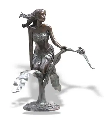 A gorgeous masterpiece from the artists imagination! A beautiful young woodland girl kneels within a giant three leaf plant while her hair blows in the wind. Estimated at 25 years of age. New condition.