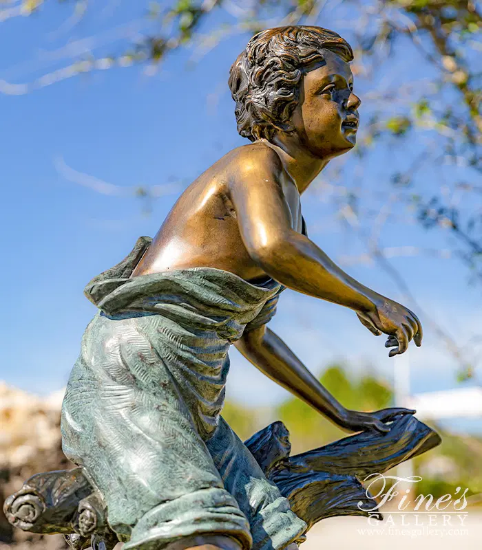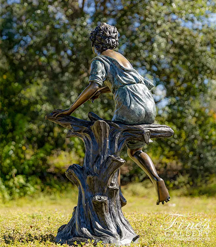 This Boy Near the River bronze fountain features a boy next to a tree stump with a fish that spouts water up towards the boy.