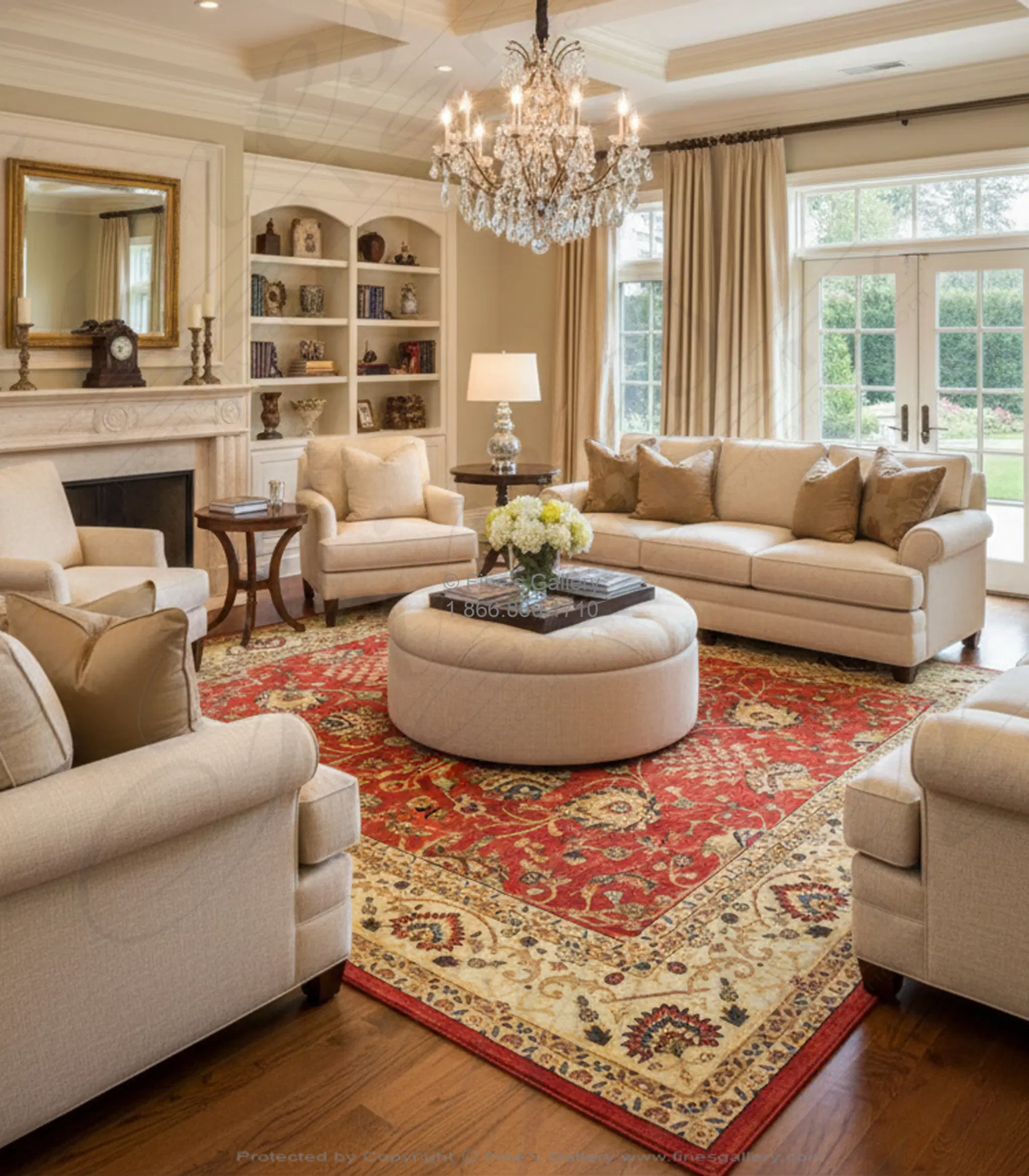 Hand-knotted wool square rug featuring rich sienna and gold hues with complementary earth tones. This traditional design showcases exquisite craftsmanship with intricate detailing throughout. Perfect for adding warmth and elegance to any living space. Durable natural wool construction ensures lasting beauty and performance. Available for purchase with person