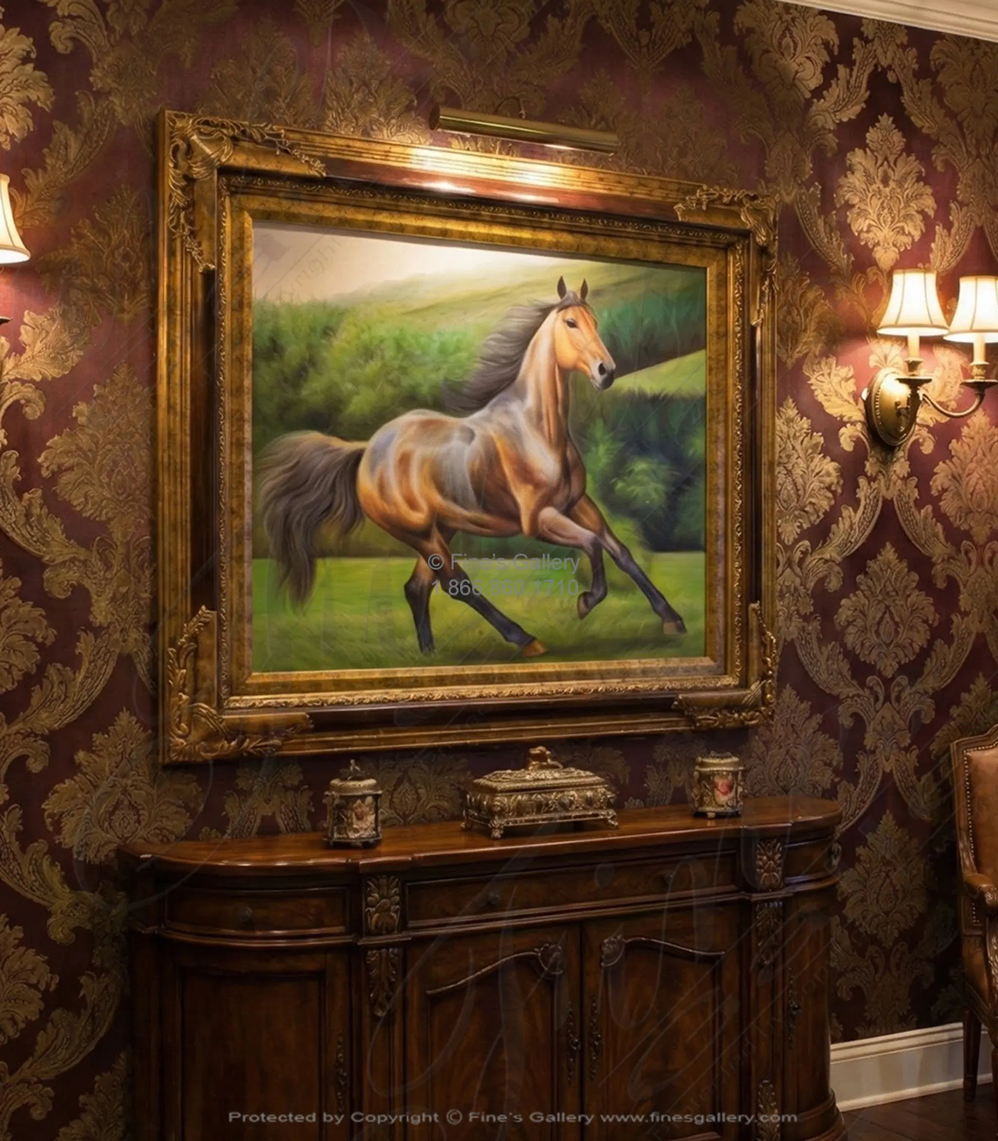 A canvas painting portraying a beautiful horse, prancing in perfection. Framed H: 41 x L: 52 Canvas: H: 47 x L: 36 Please call for additional information. Free Shipping - Framed / Unframed - All Artwork copyrighted.