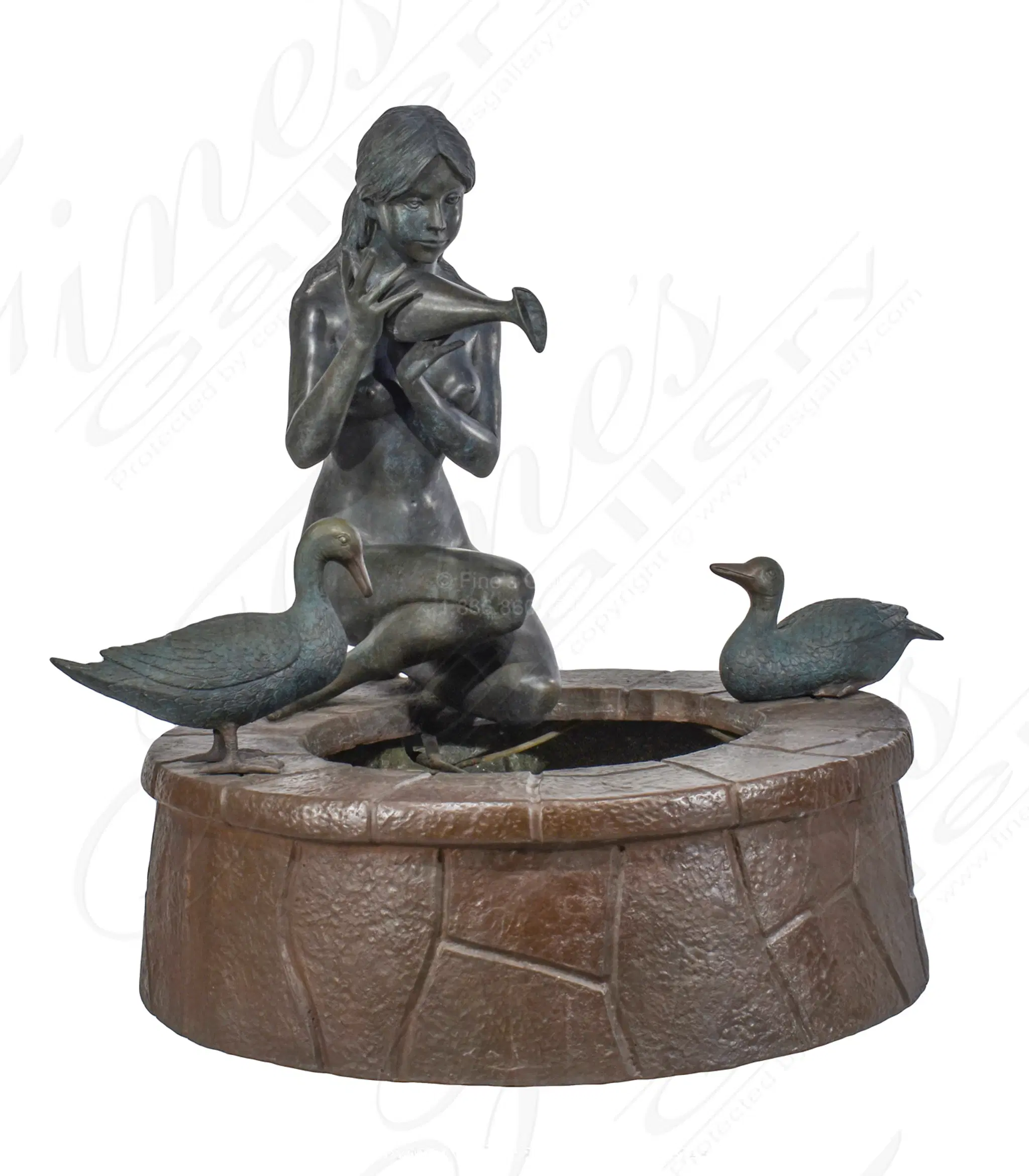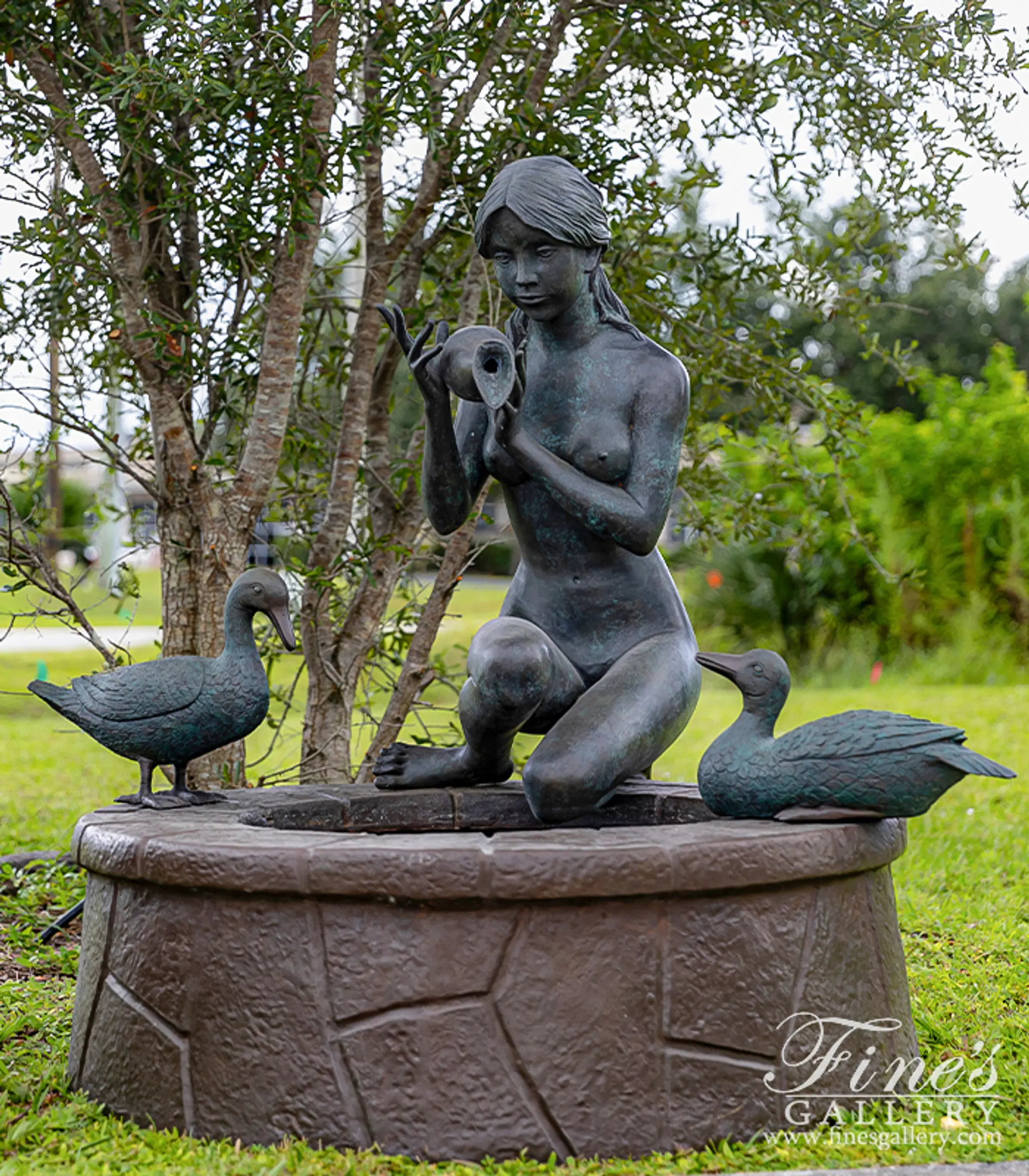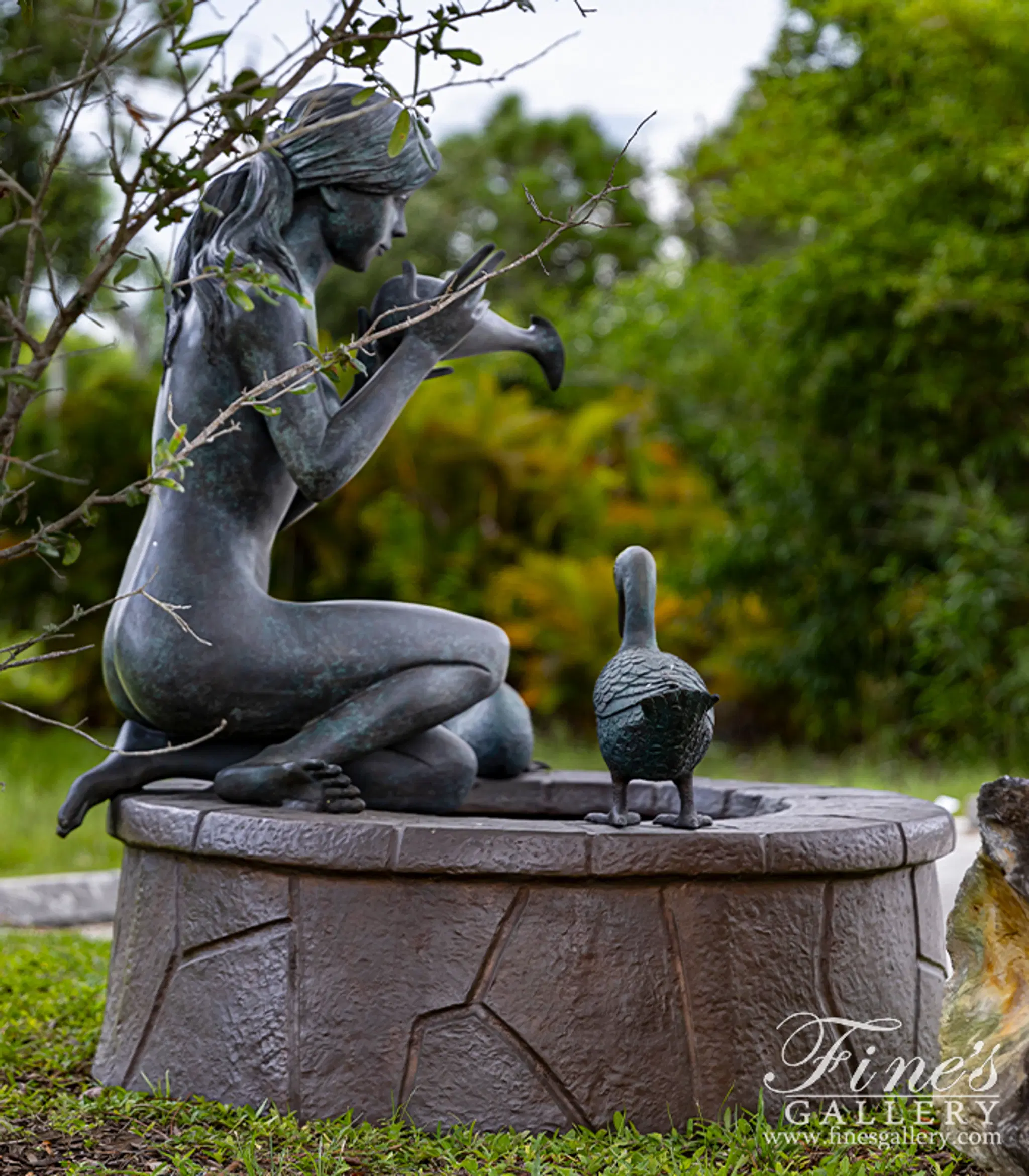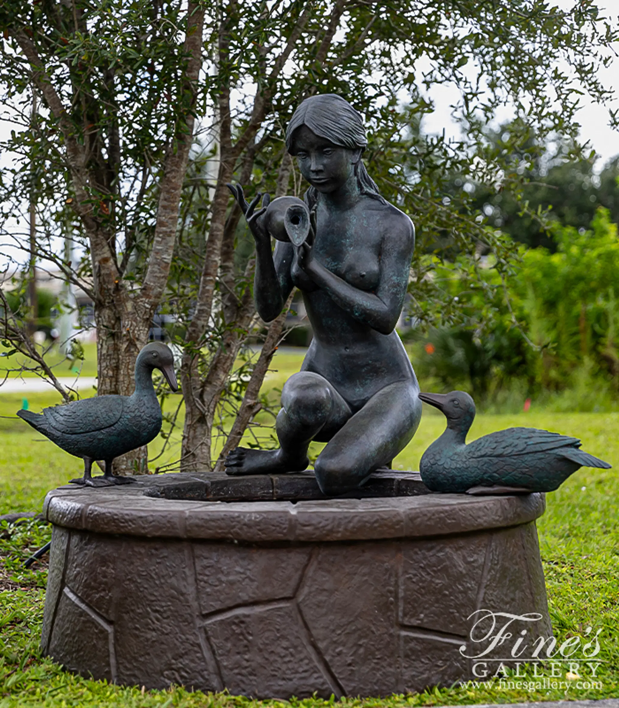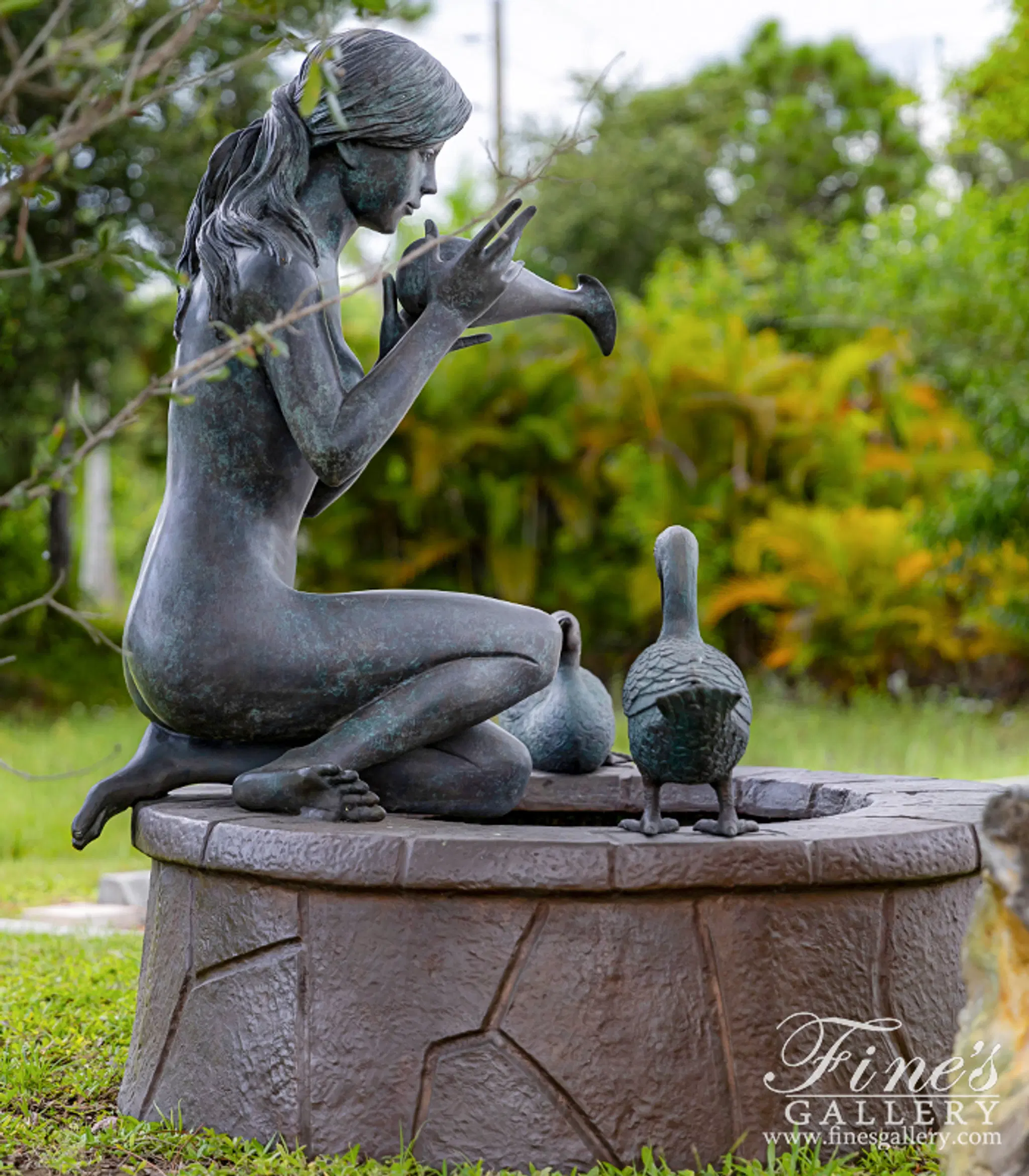 A beautiful bronze fountain of a nude female that kneels on the edge of a well, pouring a gentle stream of water from her little urn. Two beautiful bronze birds look on. Made from two gorgeous tones of bronze, she will capture your heart.