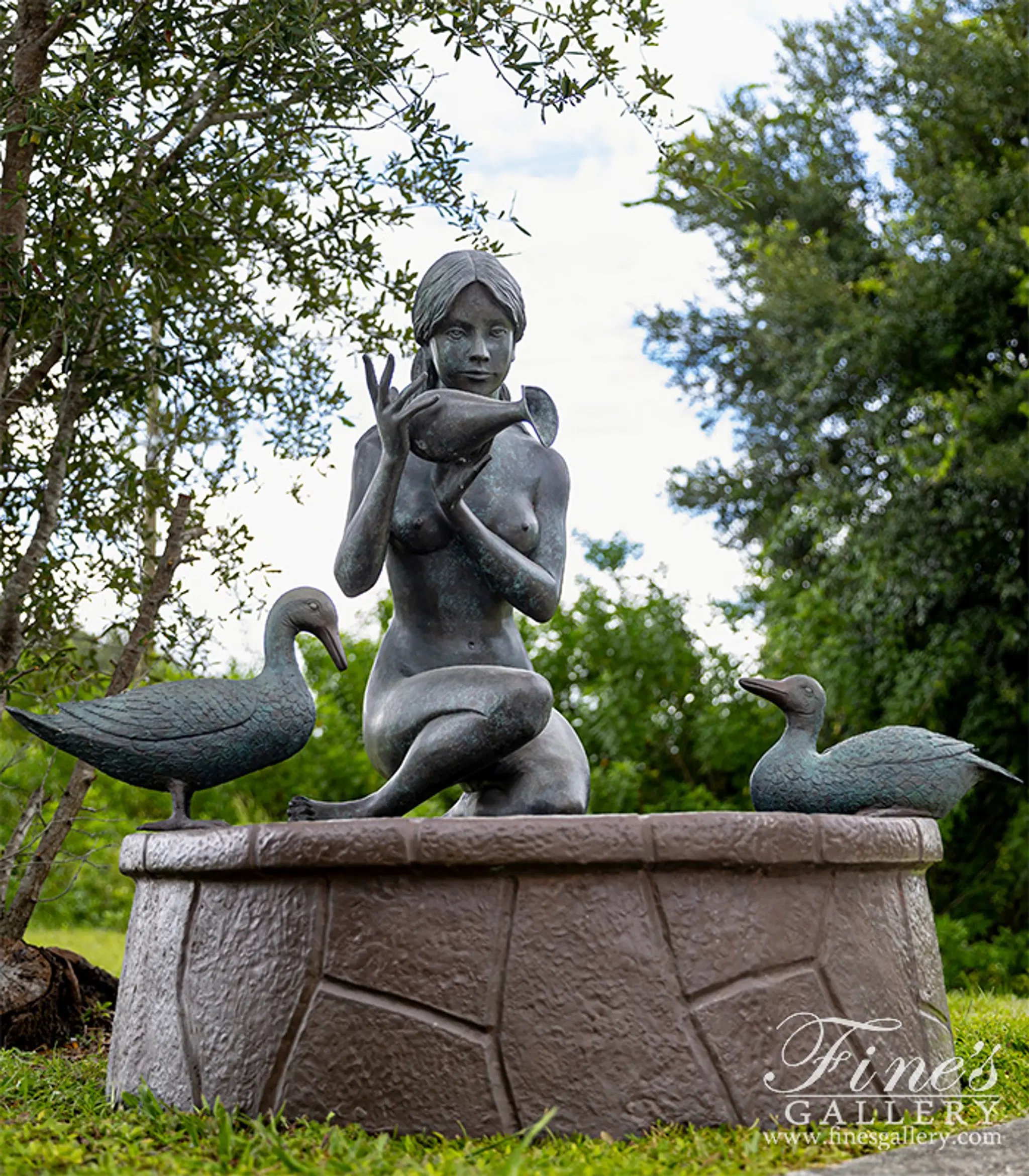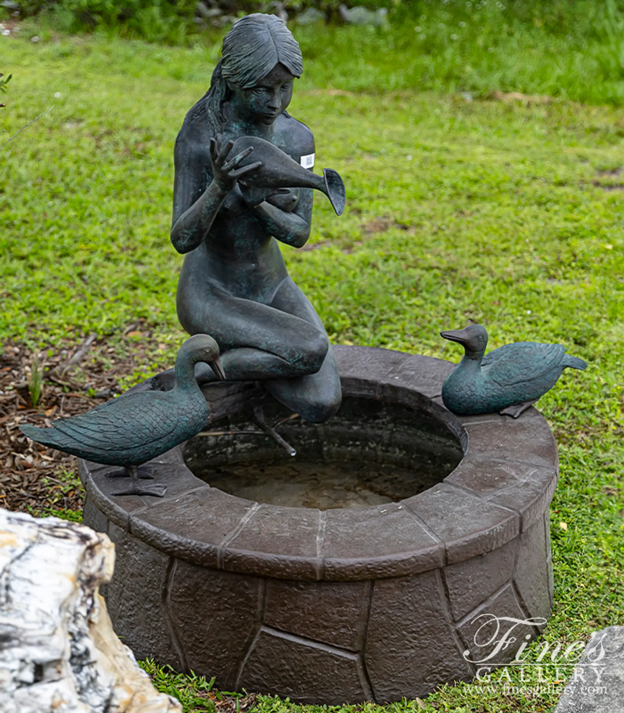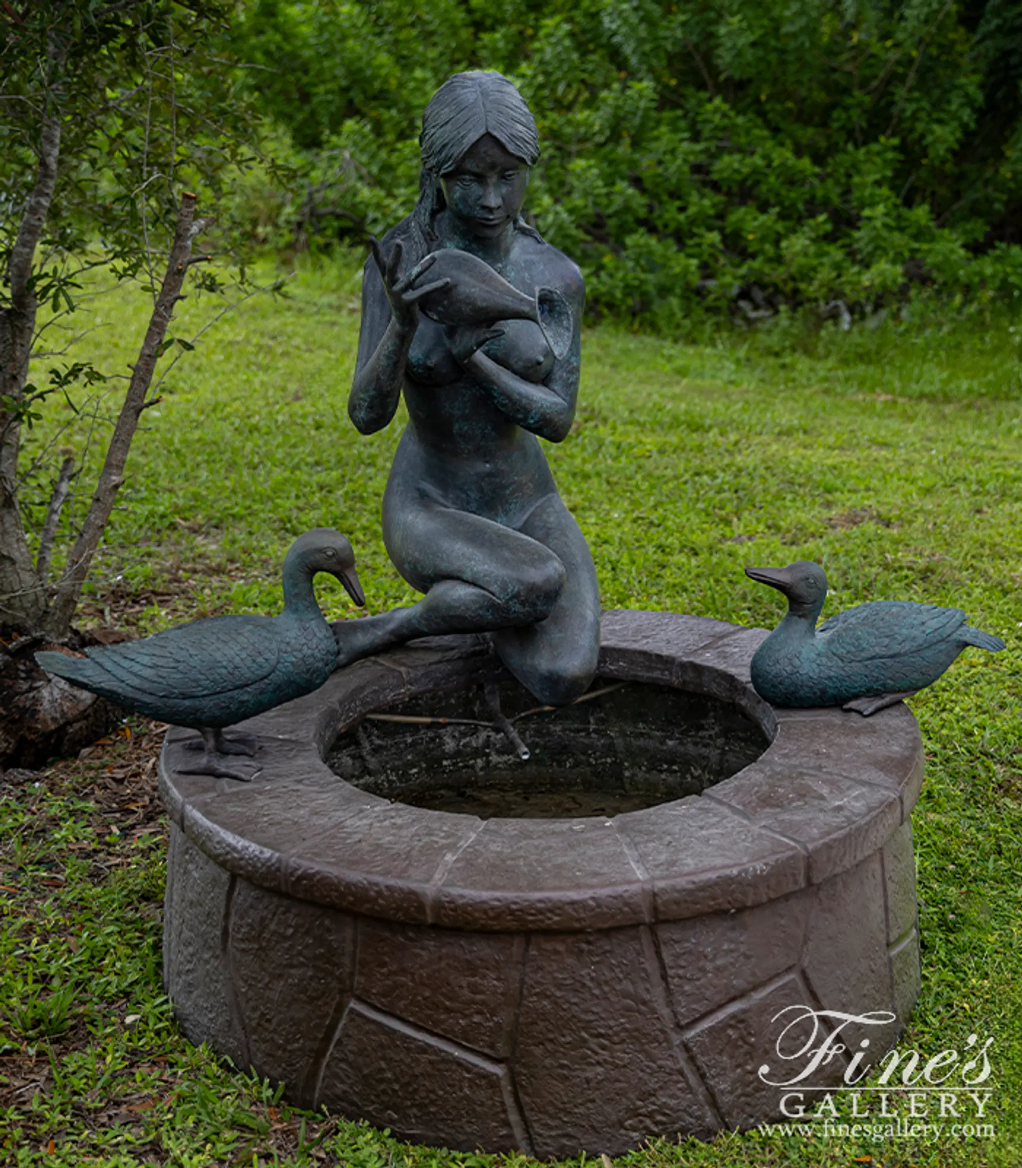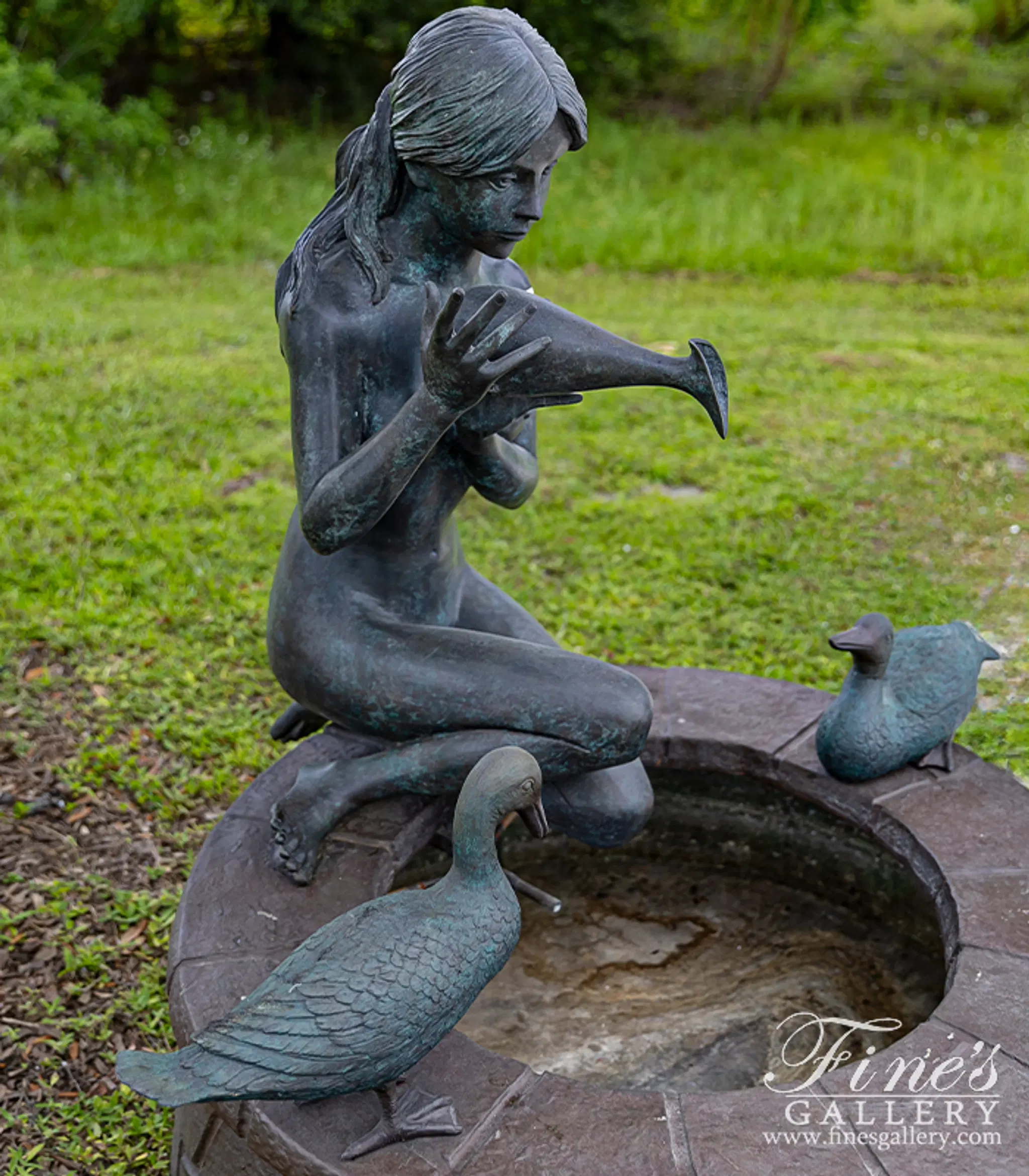 A beautiful bronze fountain of a nude female that kneels on the edge of a well, pouring a gentle stream of water from her little urn. Two beautiful bronze birds look on. Made from two gorgeous tones of bronze, she will capture your heart.