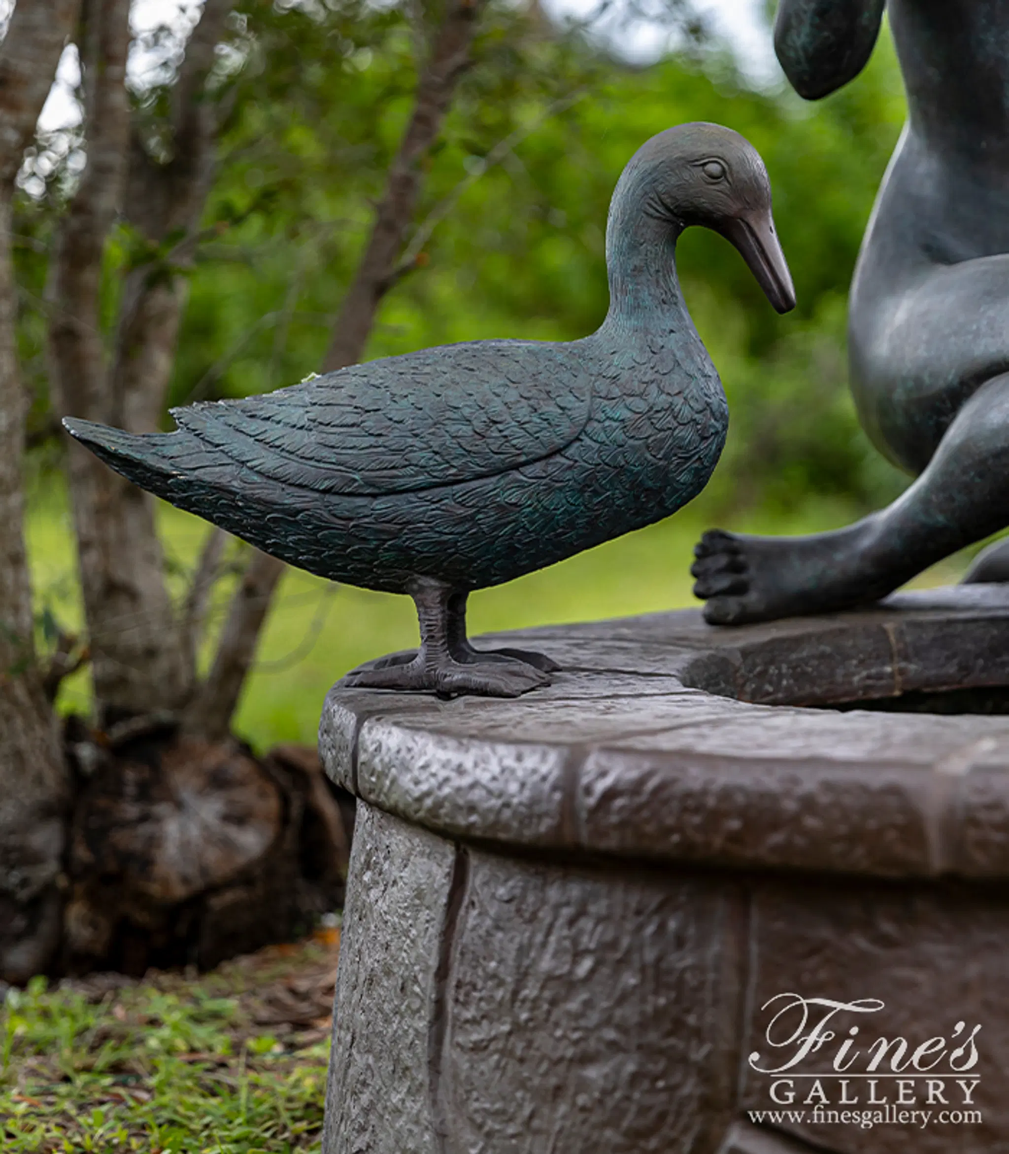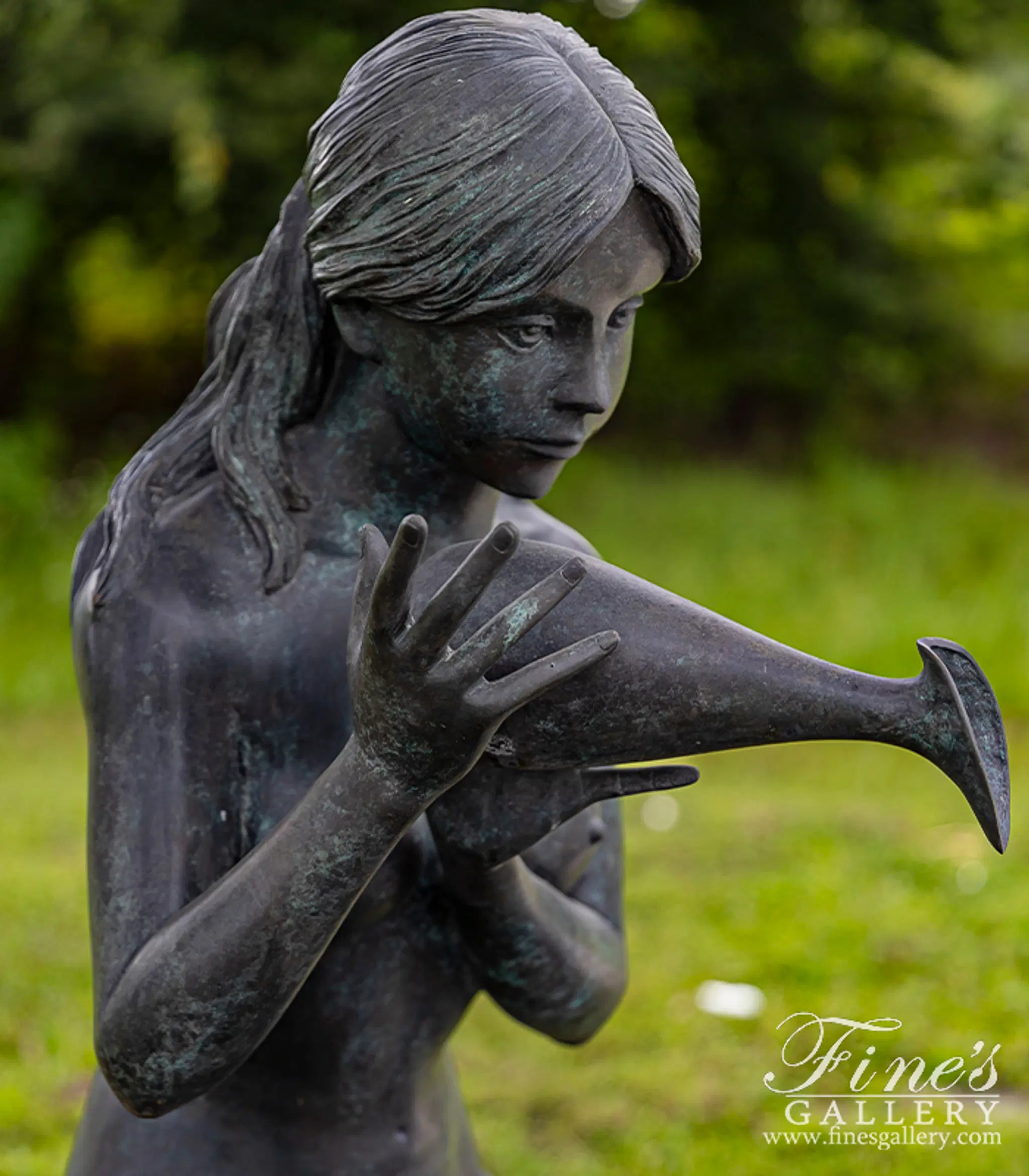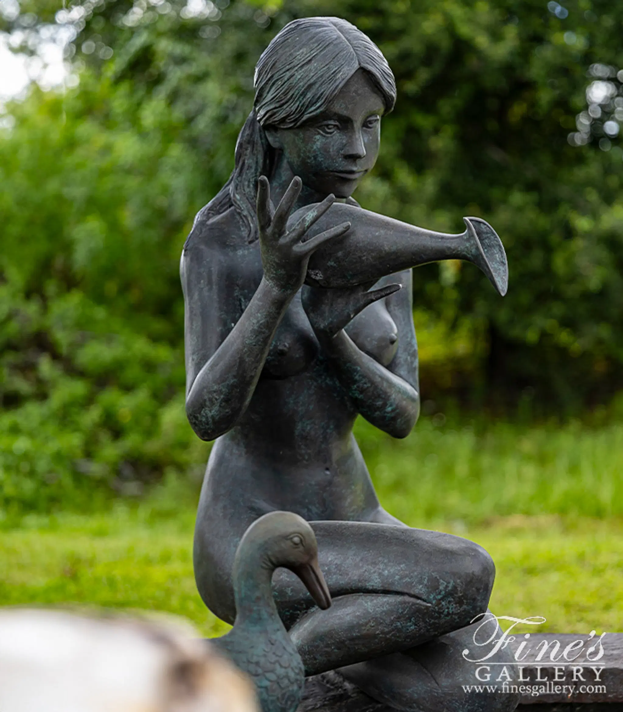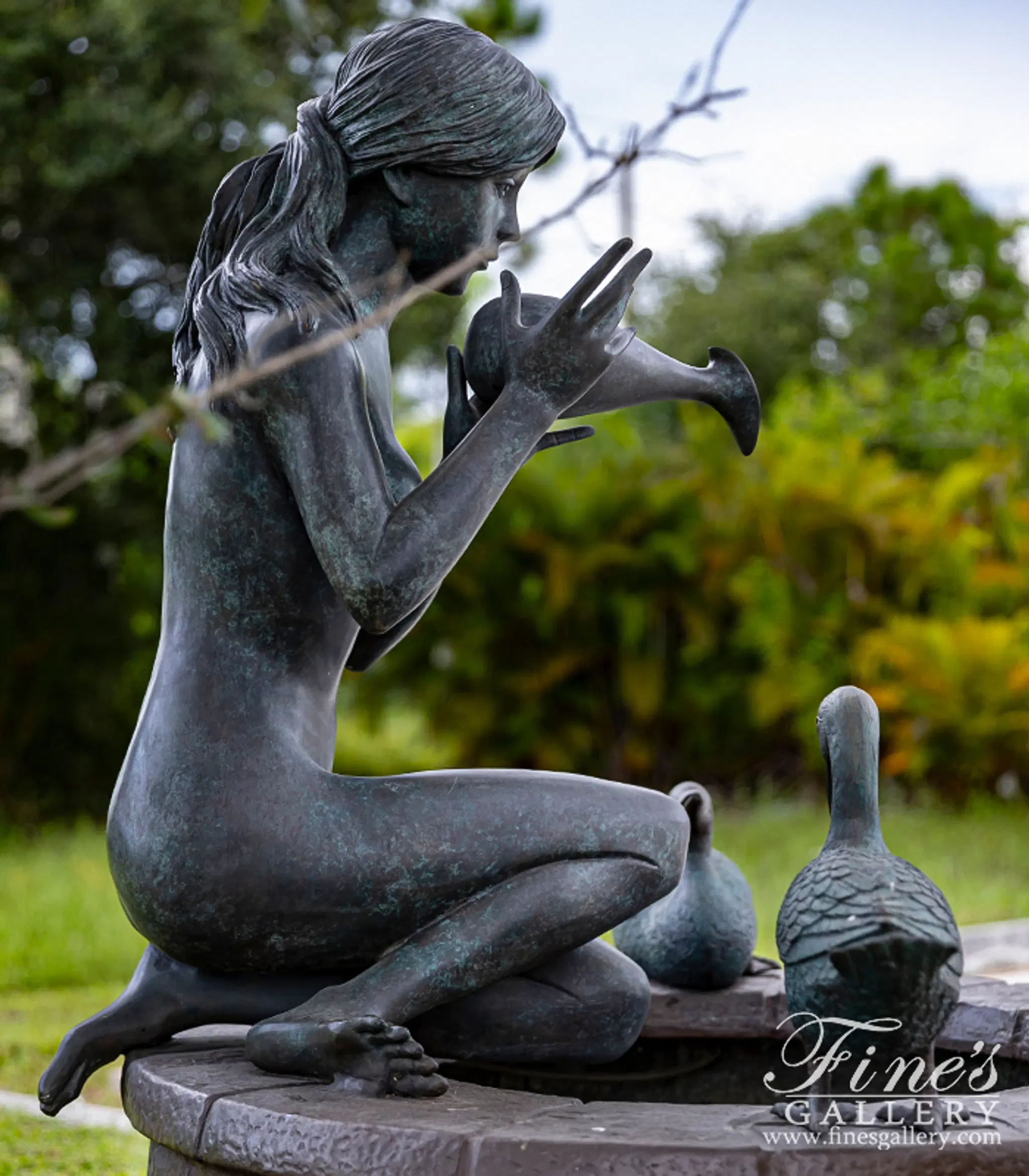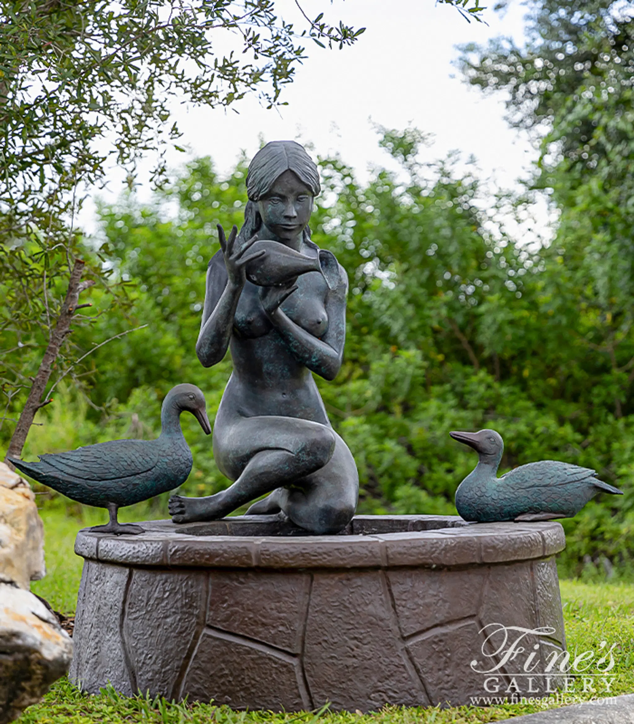 A beautiful bronze fountain of a nude female that kneels on the edge of a well, pouring a gentle stream of water from her little urn. Two beautiful bronze birds look on. Made from two gorgeous tones of bronze, she will capture your heart.
