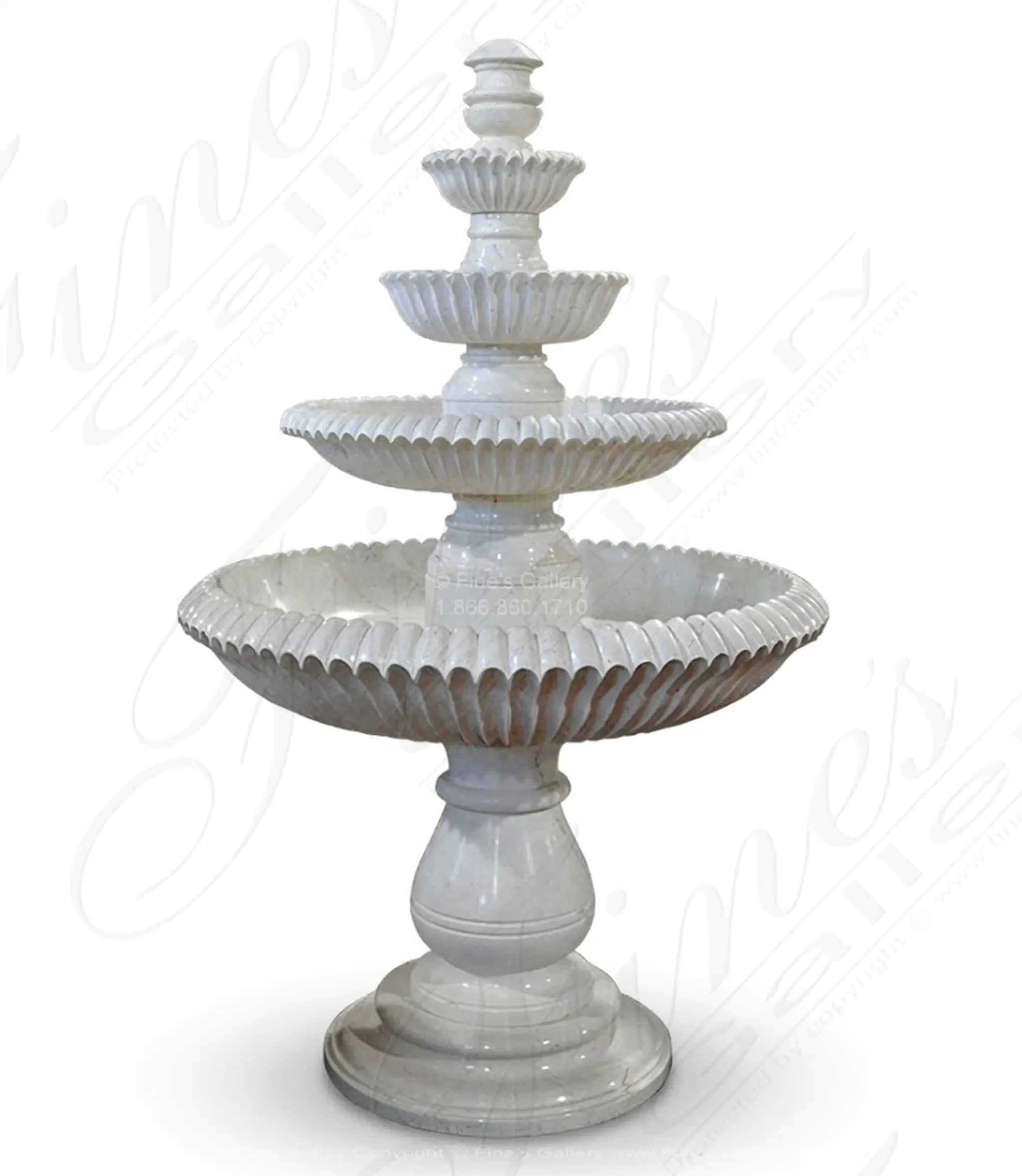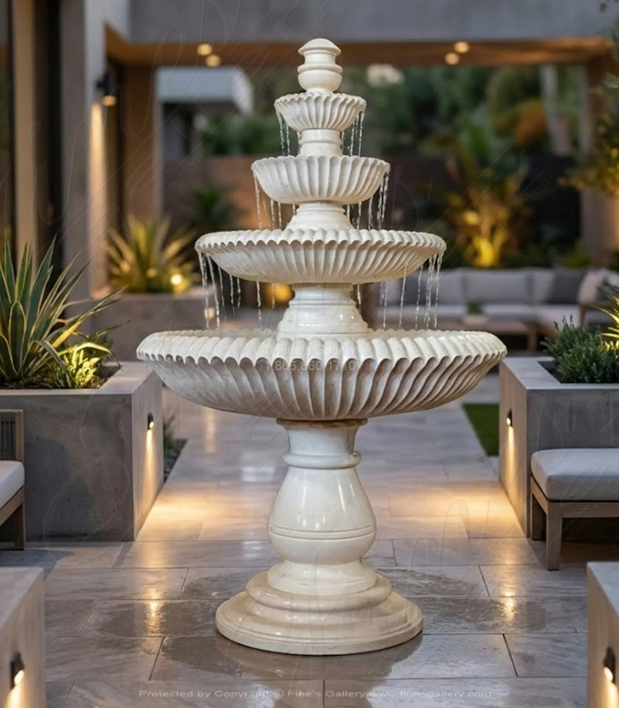 Scalloped Cream Marble Fountain four tier design with polished finish. Amazing visual and sound effects are created by this ultra sleek marble fountain feature.