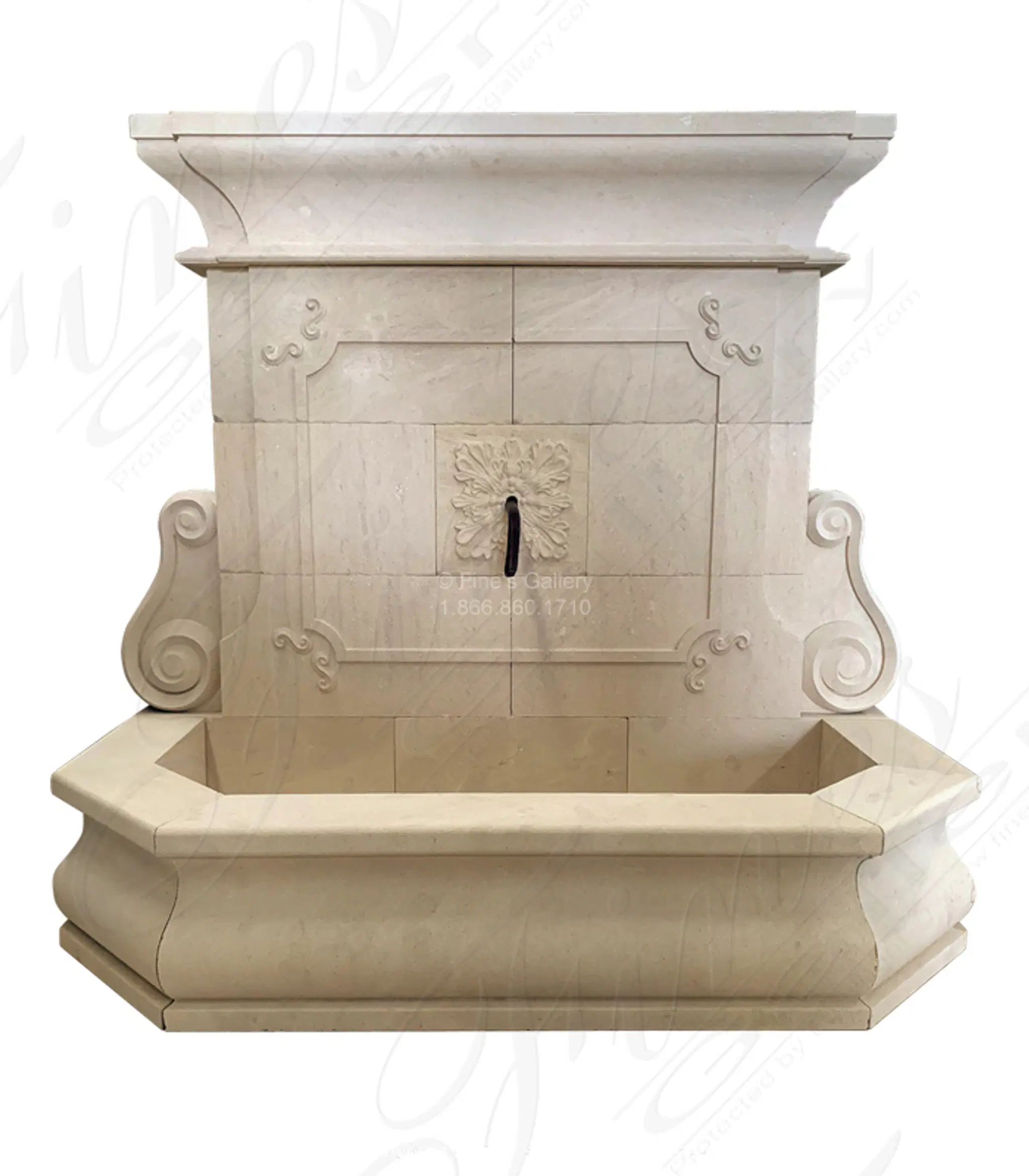 Origin - France. French Limestone Wall Fountain featuring central acanthus leaf carving motif.