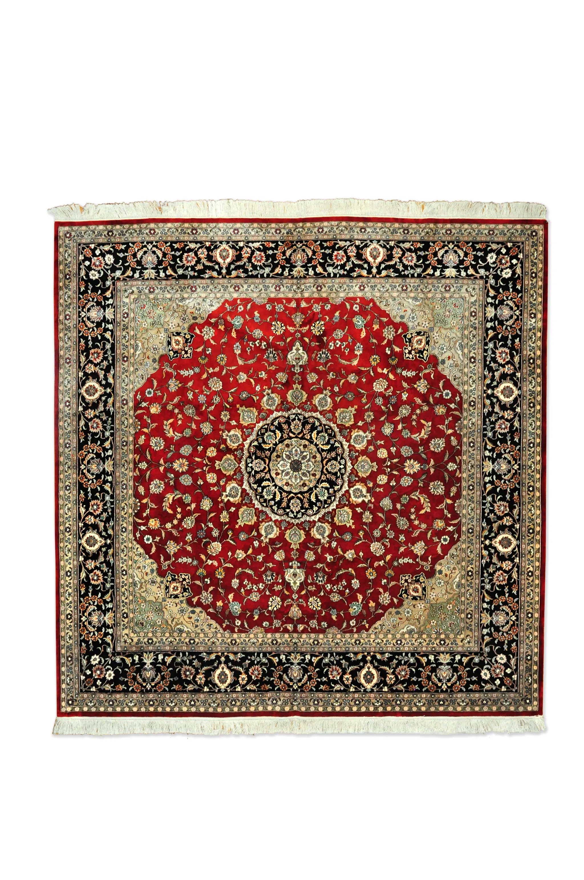 Deep red and indigo with a classic medallion in this traditional silk hand knotted rug. please call 1-866-860-1710 and talk with a sales representative at anytime.