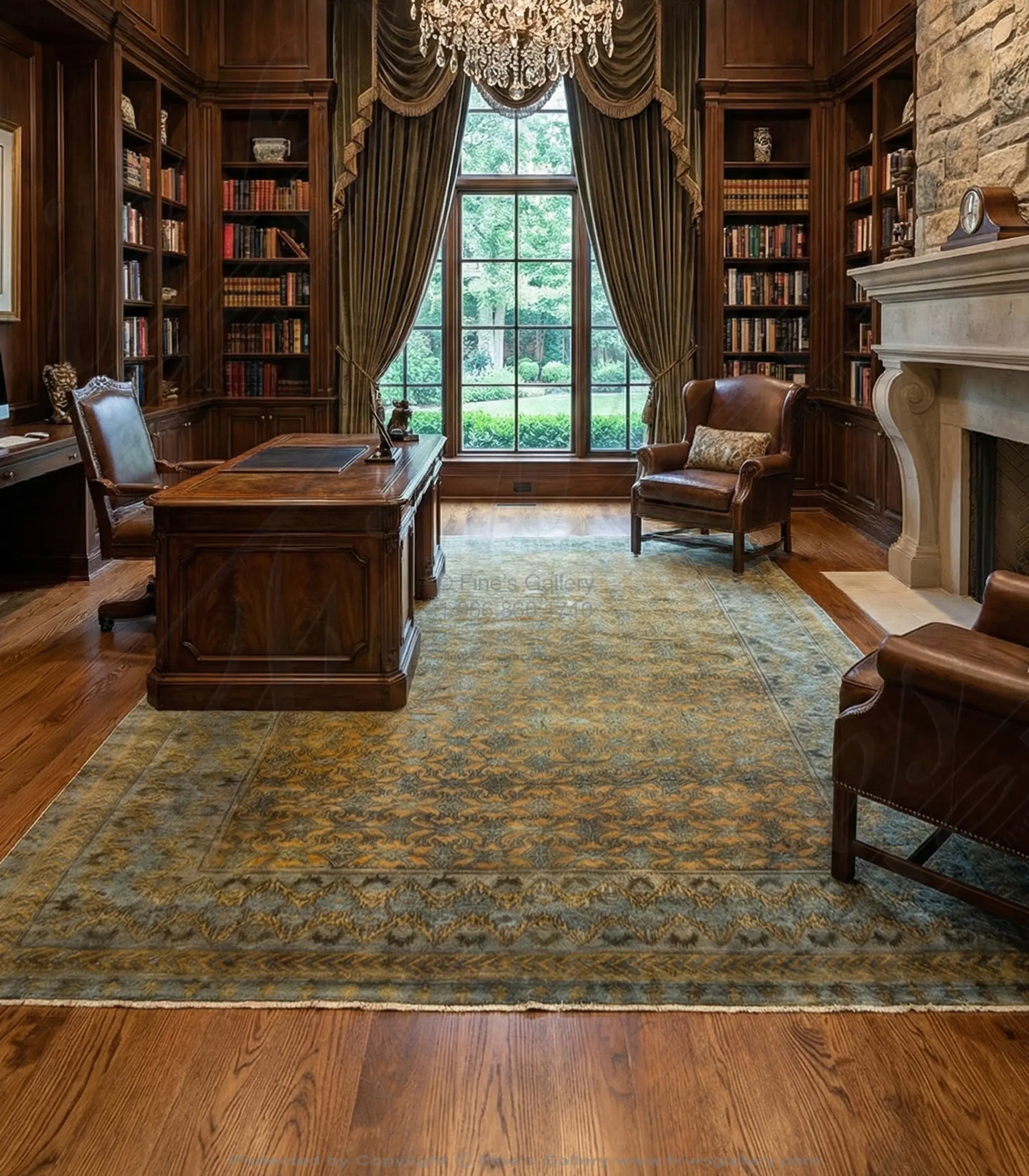 Blue grey hand knotted wool rug with an all over pattern in medium brown. Please call 1-866-860-1710 and talk with a sales representative at anytime.