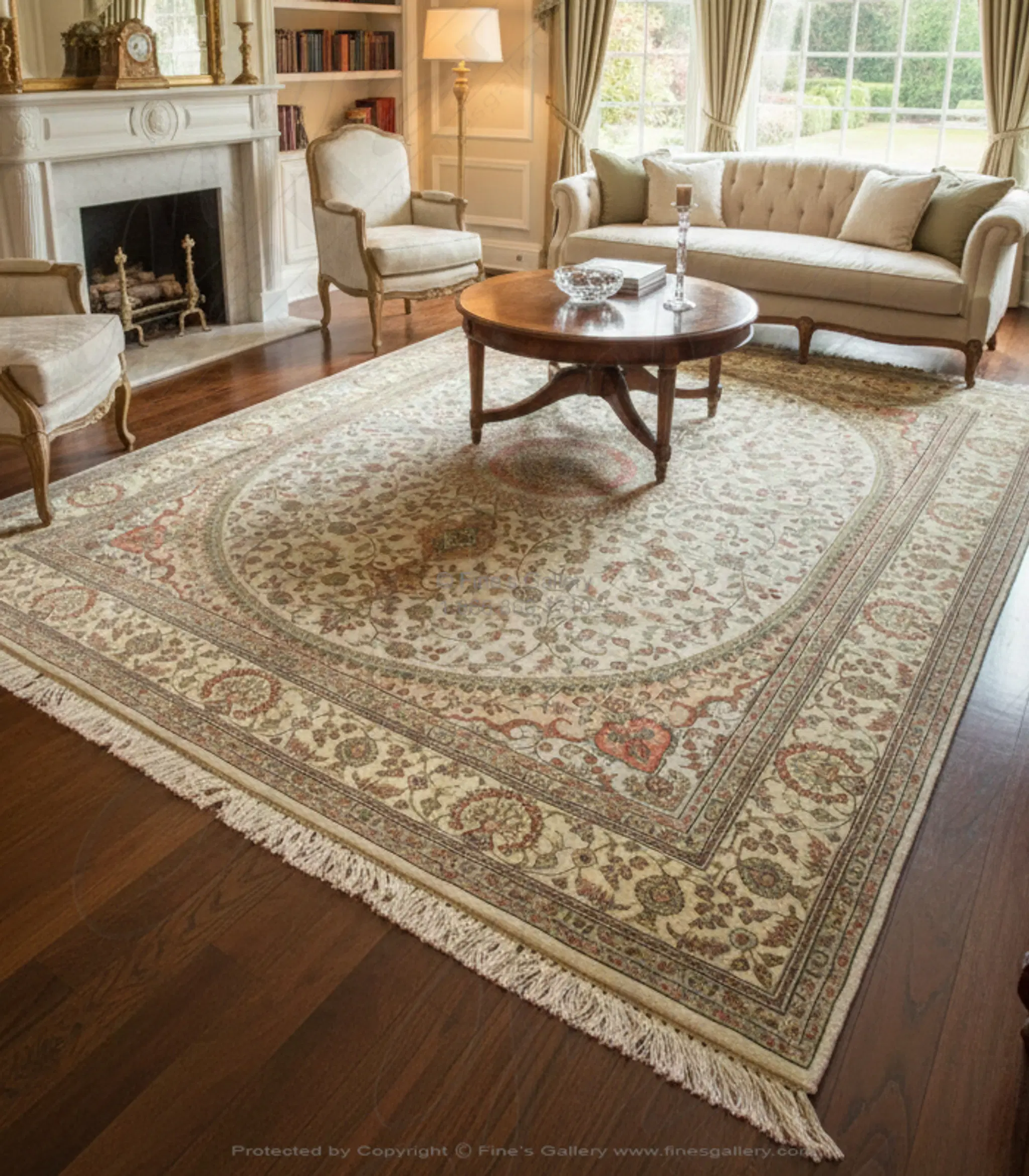 Luxury Hand-Knotted Silk Rug Rectangle - Ivory, Salmon, Coral with Yellow Border - Elegant Home Decor