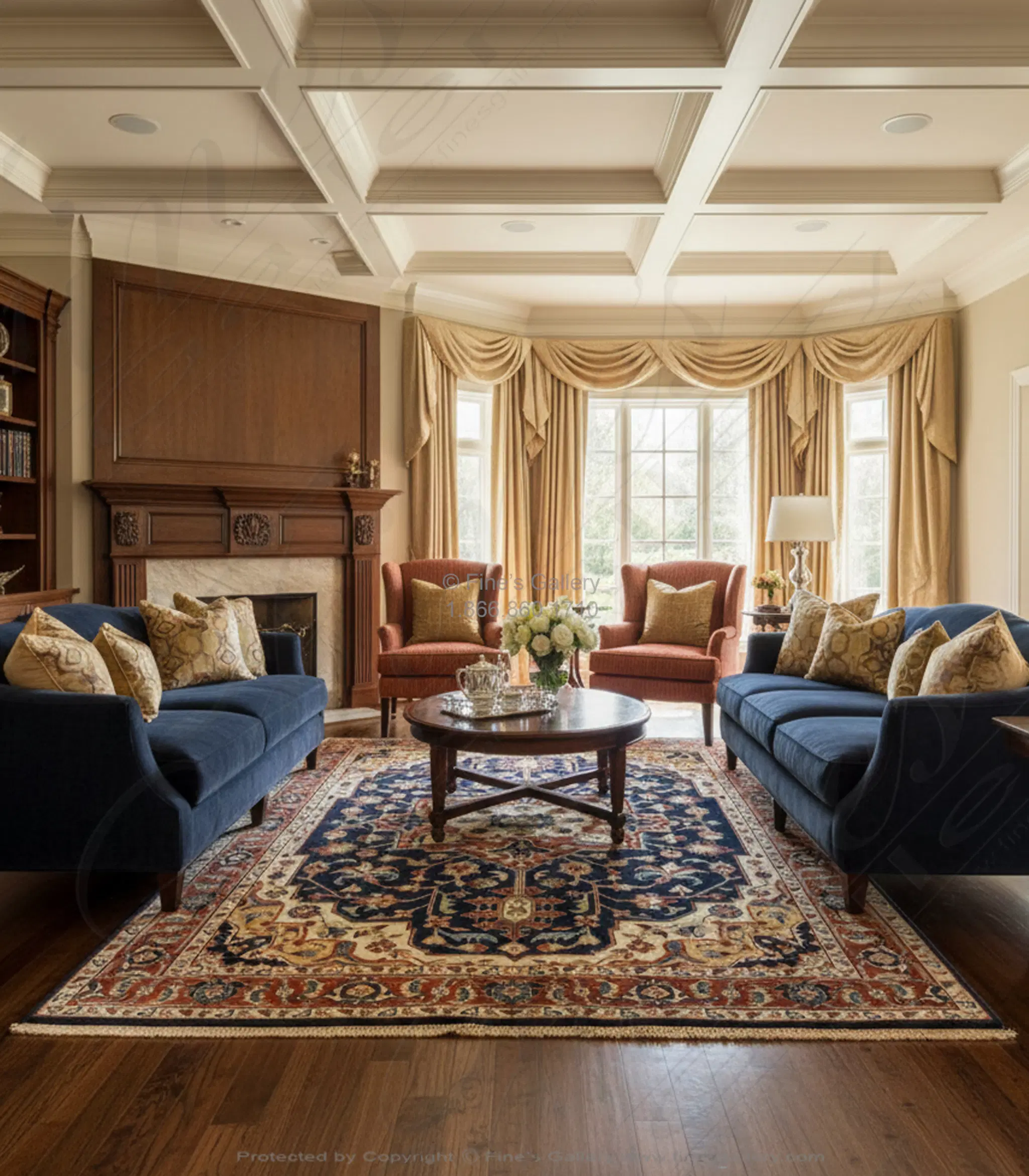 Hand Knotted Wool Area Rug - Deep Navy with Red Border - Rectangle
