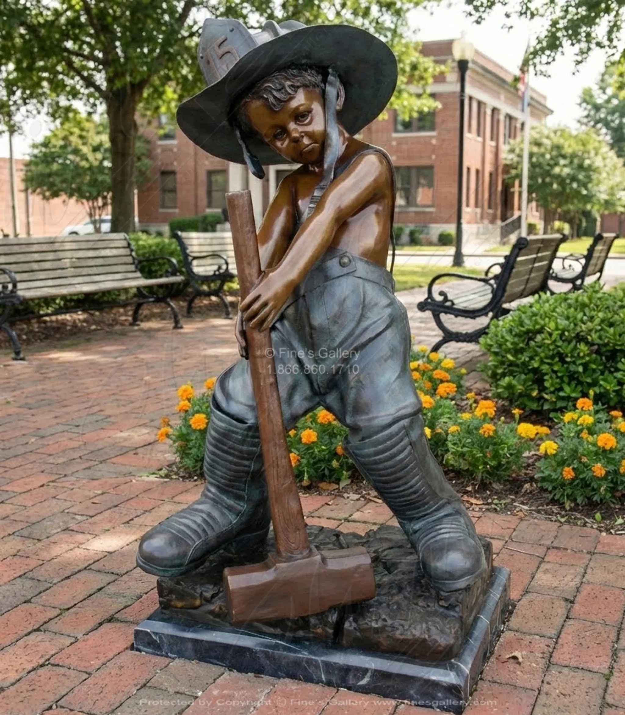 This bronze statue is a work of art in three popular tones of bronze! This determined little boy dressed in his father's fireman clothing is portrayed trying to lift a heavy sledge hammer to save the day. A vintage bronze in new condition.