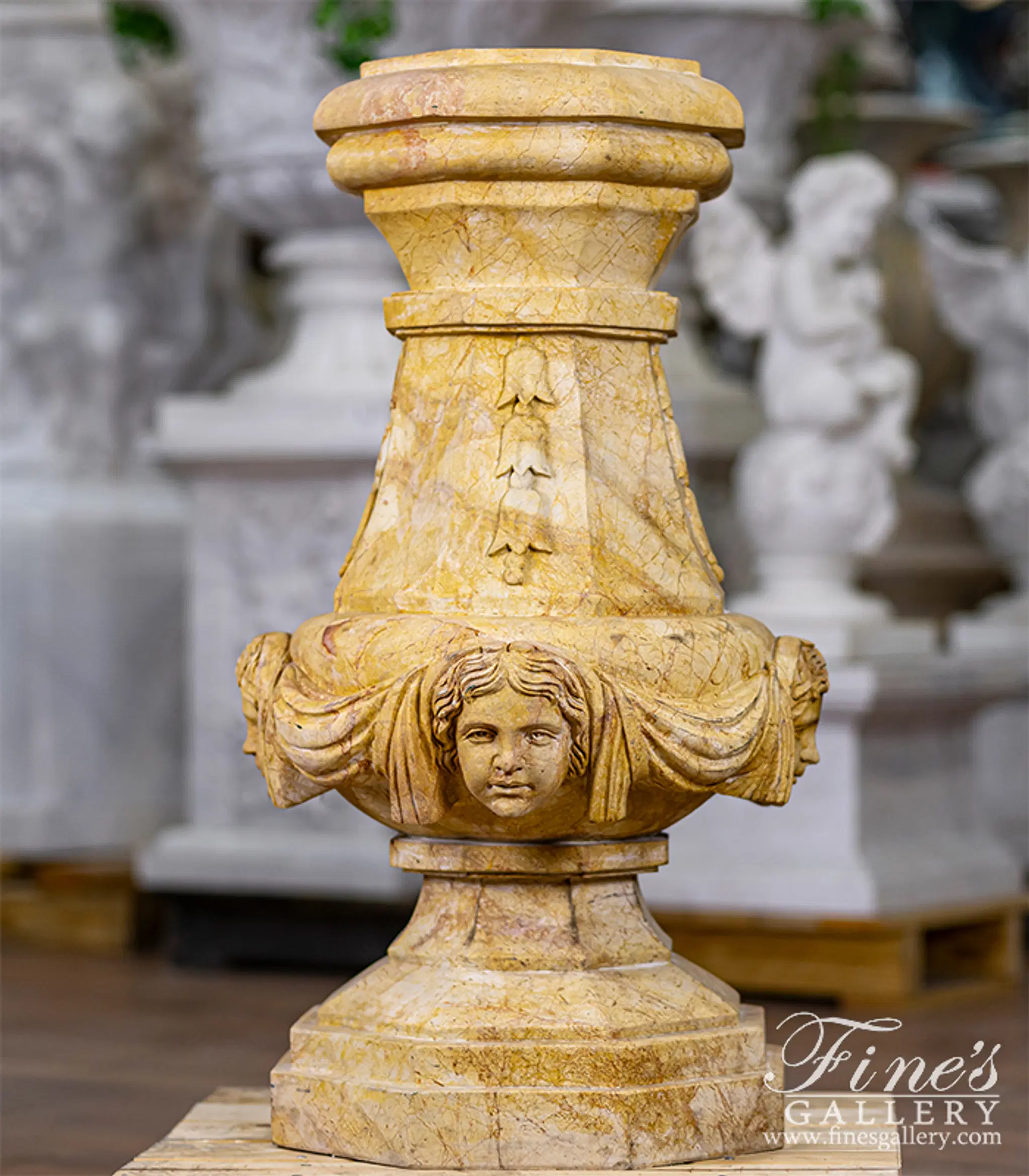 This ornate base features a stunning combination of red and yellow toned marbles, with incredible detail within the hand carved artisry ma. Elegant design features beautifully sculpted children's faces. Contact us today by phone or email. Rose color base.