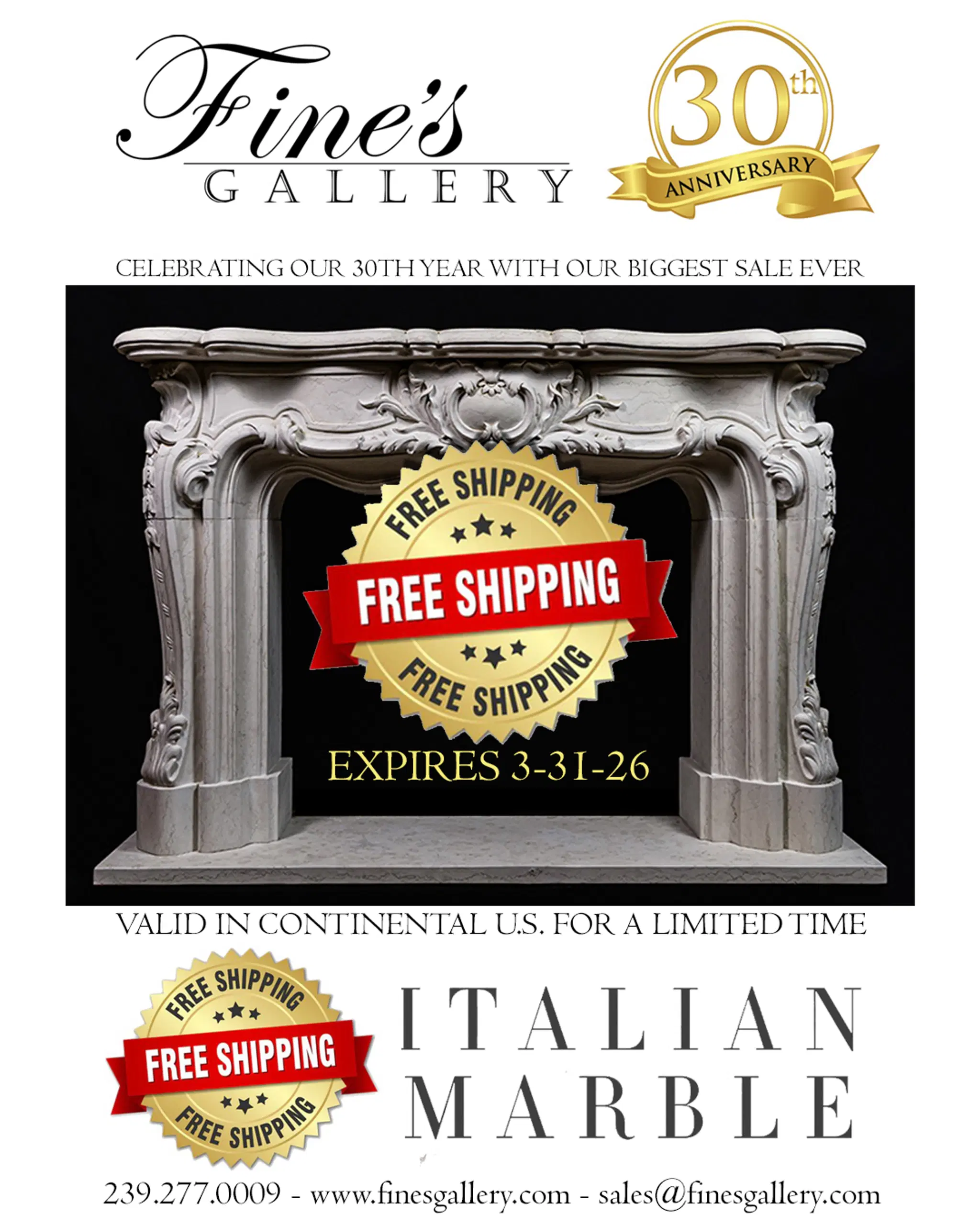 HomeBlogCelebrate our 30th Year in Business with Free Shipping on our inventory of Iitalian Marble MantelsBack to Blog02/03/2026Celebrate our 30th Year in Business with Free Shipping on our inventory of Iitalian Marble MantelsArabascato Orobico Rosso Marble Mantels are in stock, and ship free through 3/31/26Arabascato Corchia Marble Mantels are in stock, and ship free through 3/31/26Bianco Perlino Marble Mantels are in stock, and ship free through 3/31/26Ivory Travertine Mantels are in stock, and ship free through 3/31/26Breccia Viola Mantels are in stock, and ship free through 3/31/26Tropical Storm Mantels are in stock, and ship free through 3/31/26Roman Travertine Mantels are in stock, and ship free through 3/31/26Perlato Royal Mantels are in stock, and ship free through 3/31/26Calacatta Mantels are in stock, and ship free through 3/31/26