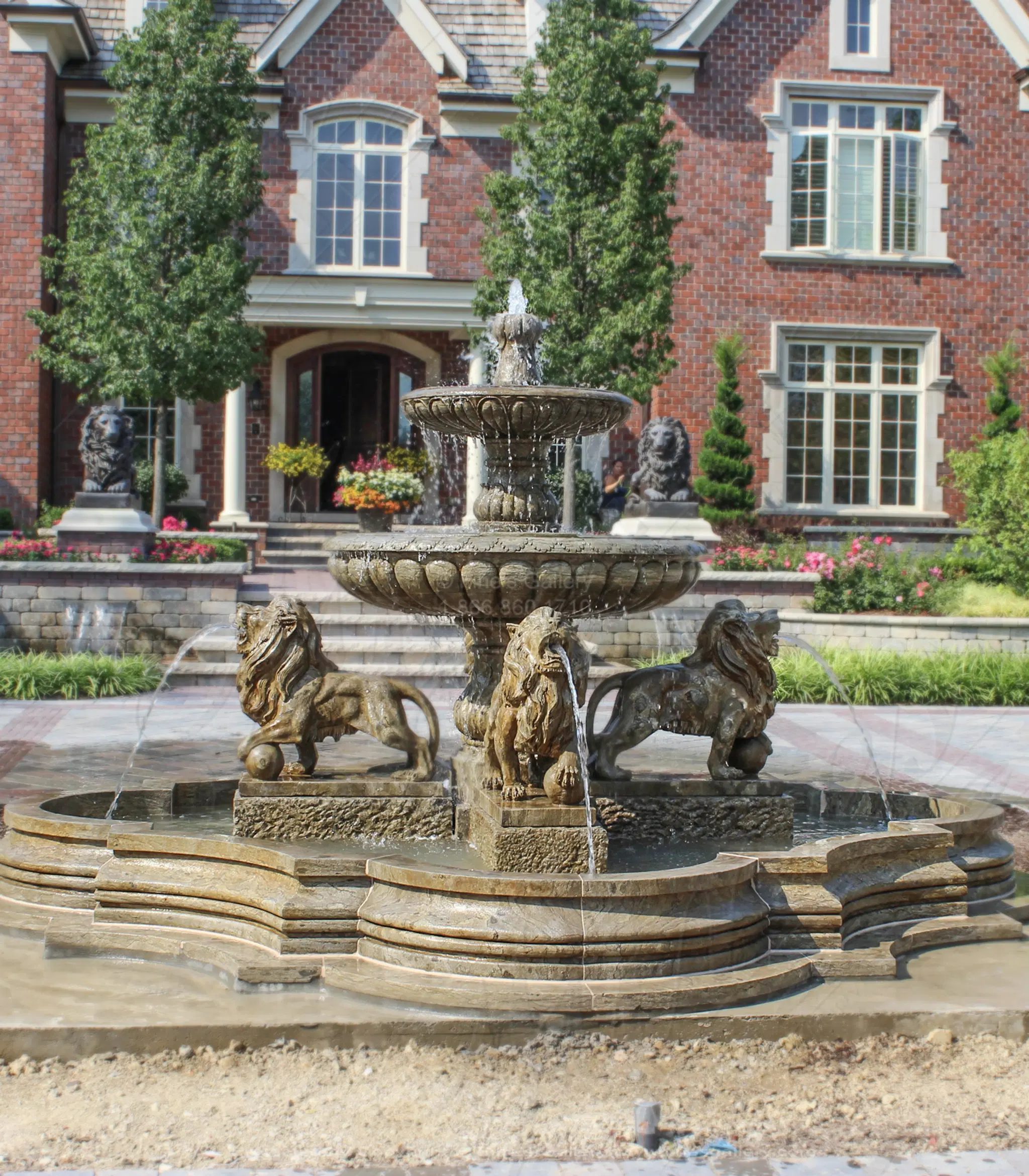 Old World Roman Marble Lions Fountain carved from an aged marble with rustic tones. Perfect for exterior application in all climates. Available in white marble and earth toned granite. One of a kind Imported European style natural stone fountain.