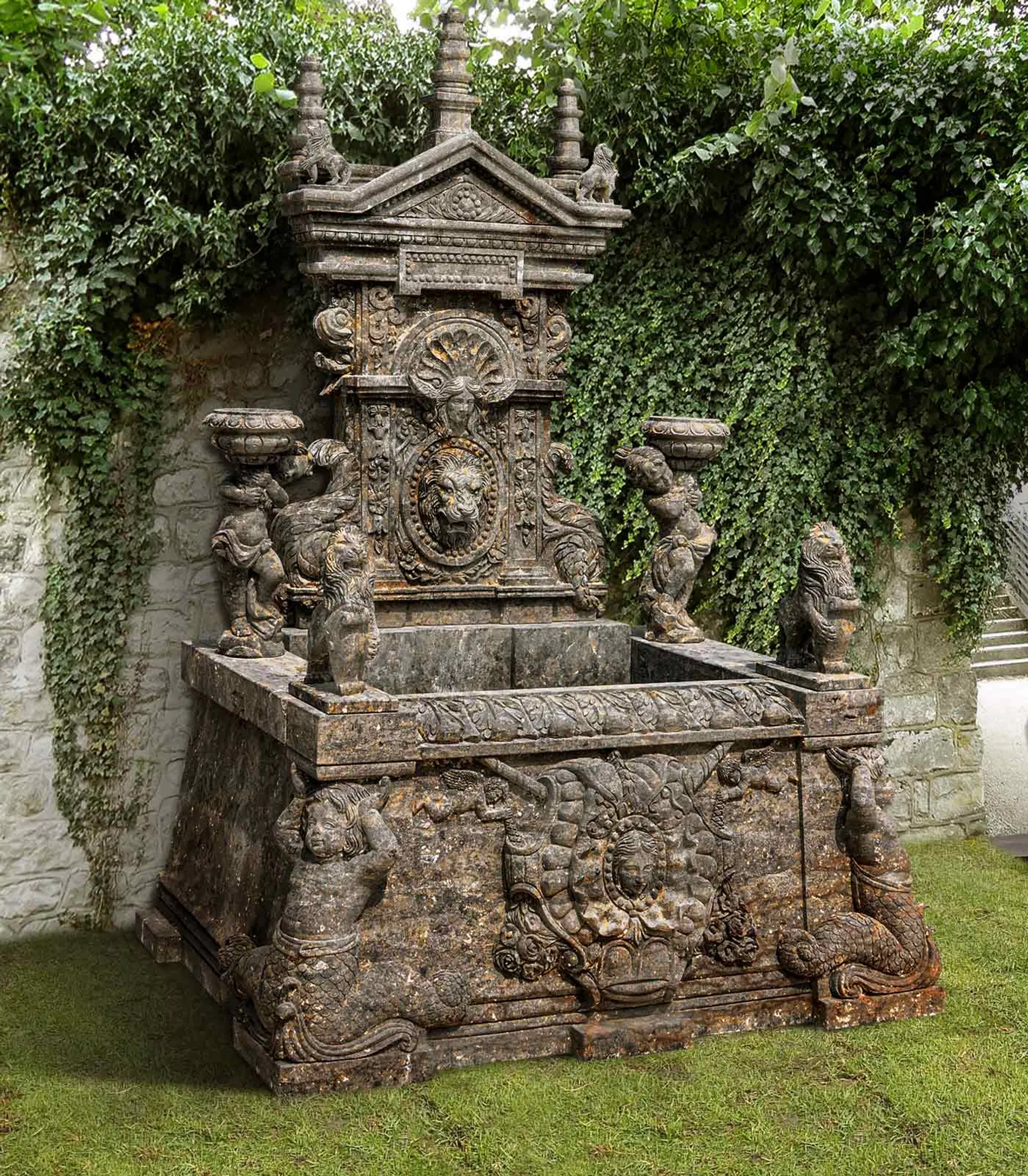 Kings Castle Antique Gray Natural Stone Wall Fountain. This elaborate hand carved masterpiece features lion head, lions, cherubs with urns, and elaborate hand carved scrollwork throughout the entire structure.