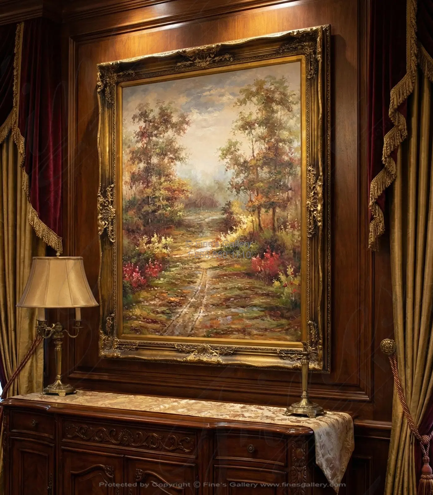 A canvas painting, a forest with old-growth trees and lush warmth, exploring the path of the unknown. Please call for additional information. Free Shipping - Framed 45x57 / Unframed 35x47 - All Artwork copyrighted.