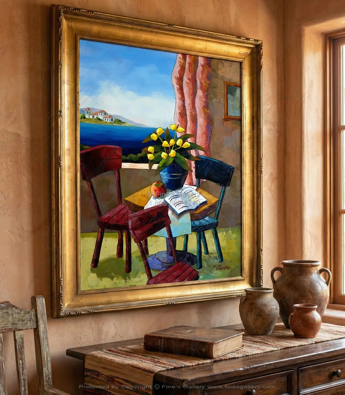 Chairs, flowers, fruit and a good book, gives the power of a magical day filled with positivity and hope on this canvas painting. Please call for additional information. Free Shipping - Framed / Unframed - All Artwork