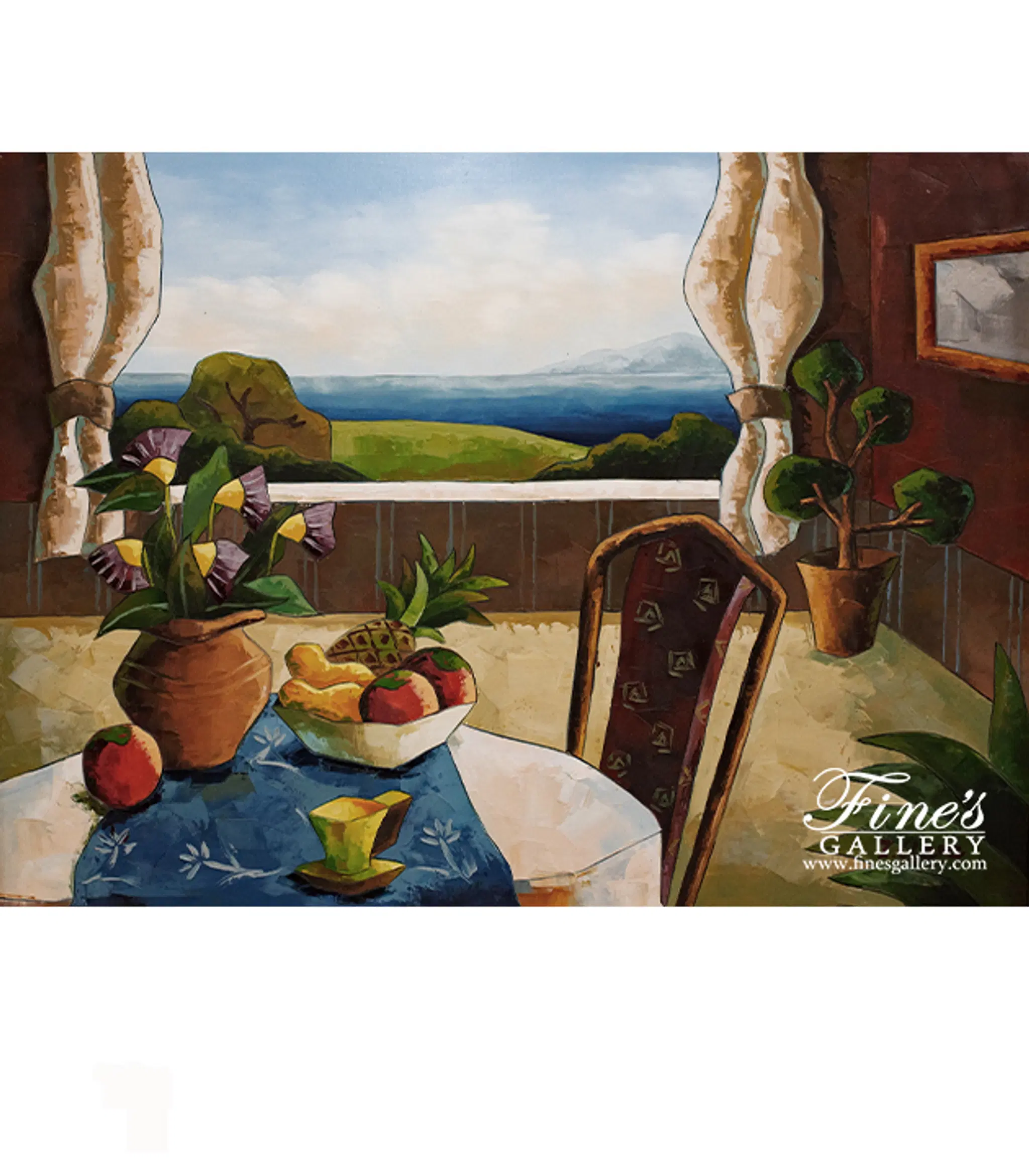Canvas art depicting fruit, flowers and daylight. With the sea and mountains, ready for peace and enjoyment. Please call for additional information. Free Shipping - framed / Unframed H: 29 L: 38 - All Artwork copyrighted.