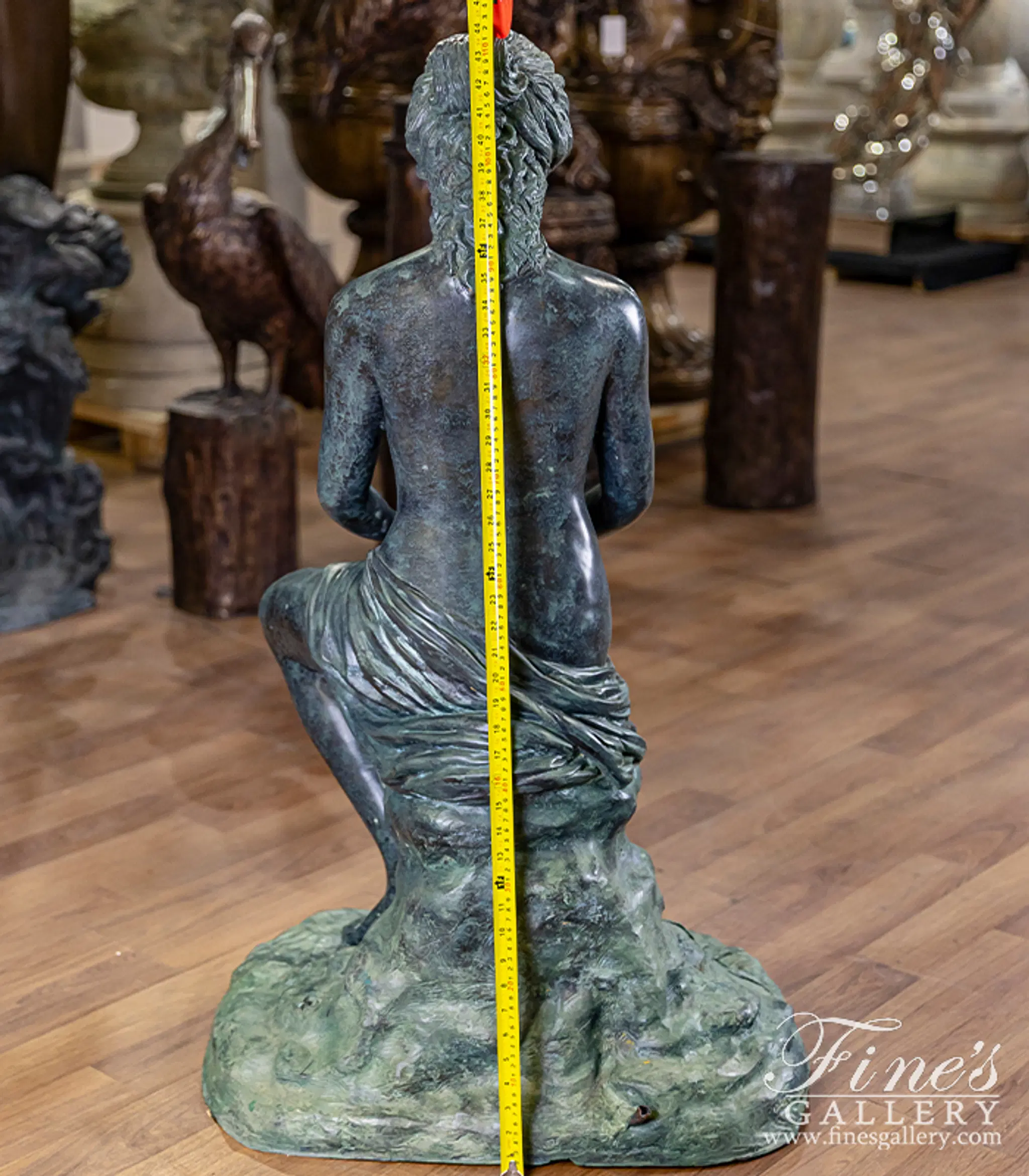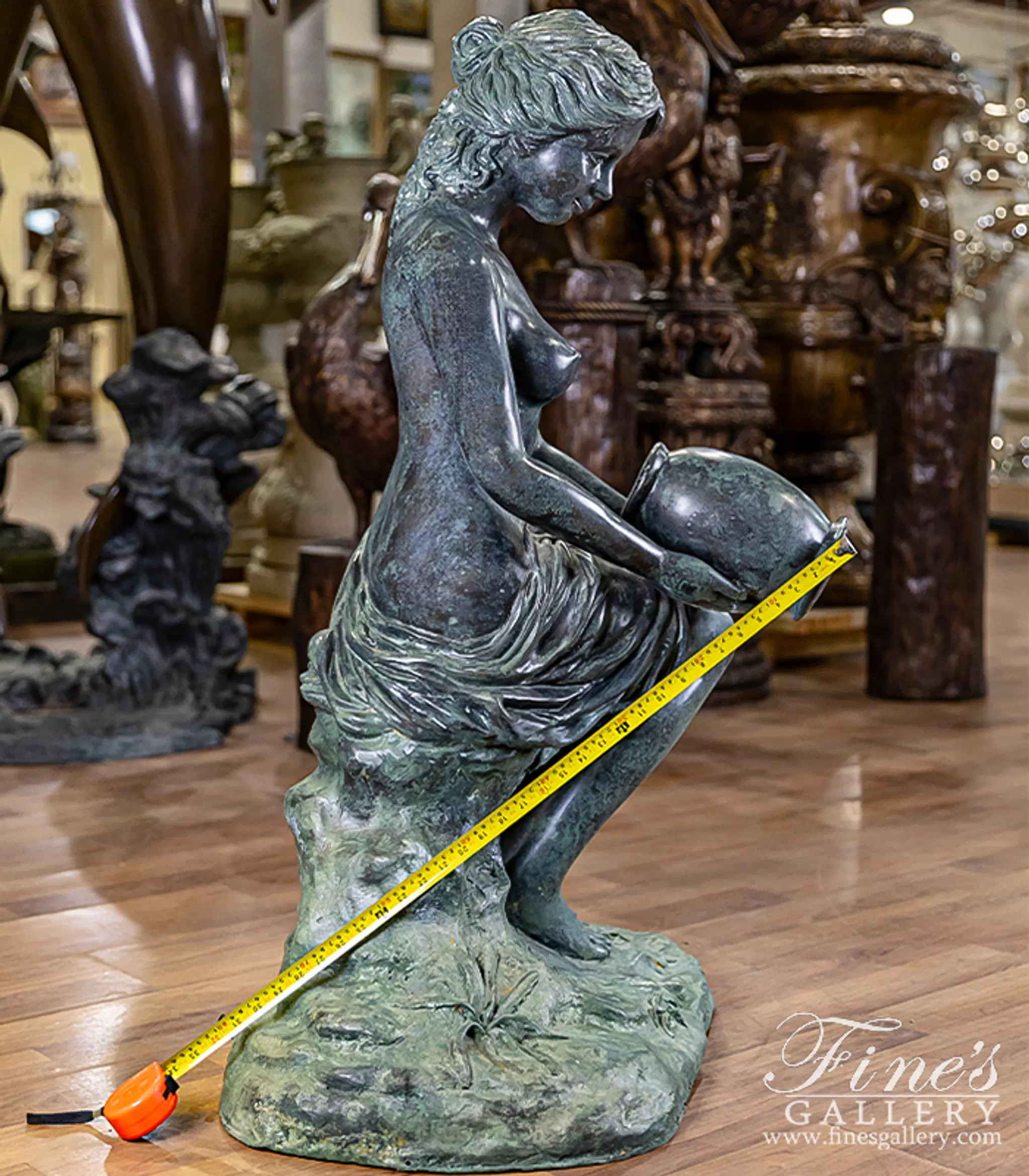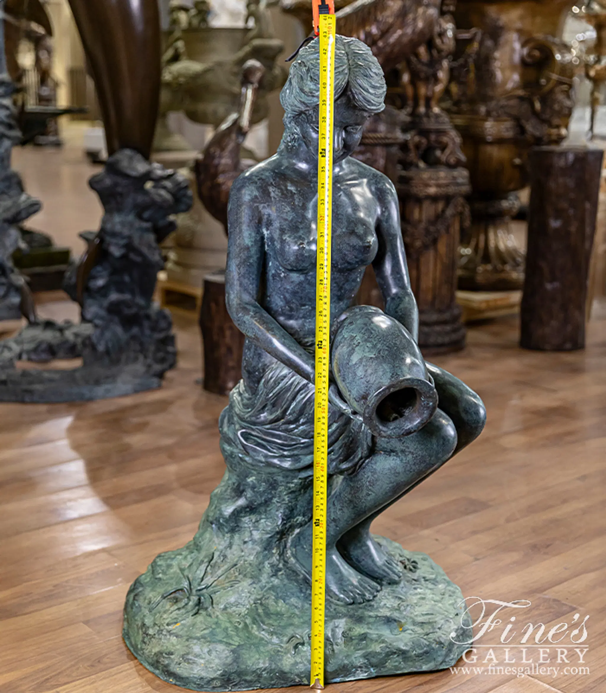 Sitting on a rocky centerpiece, a flowing garment gathered about her, she gracefully pours water from an ancient jar. Lost wax cast in Patina Bronze, we're proud to offer this quality piece for your very own private collection. The maiden bronze fountain.