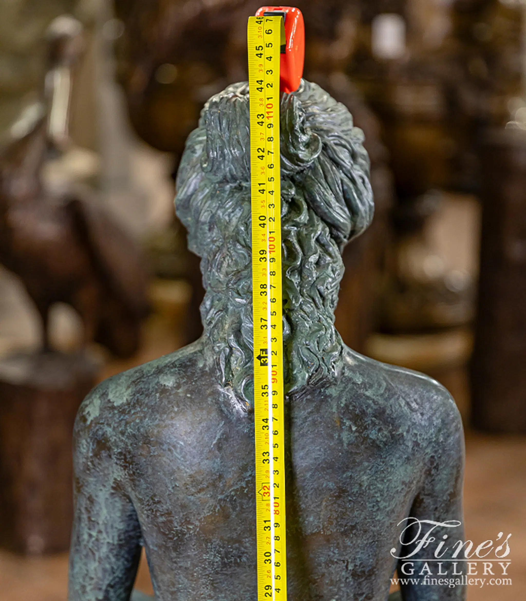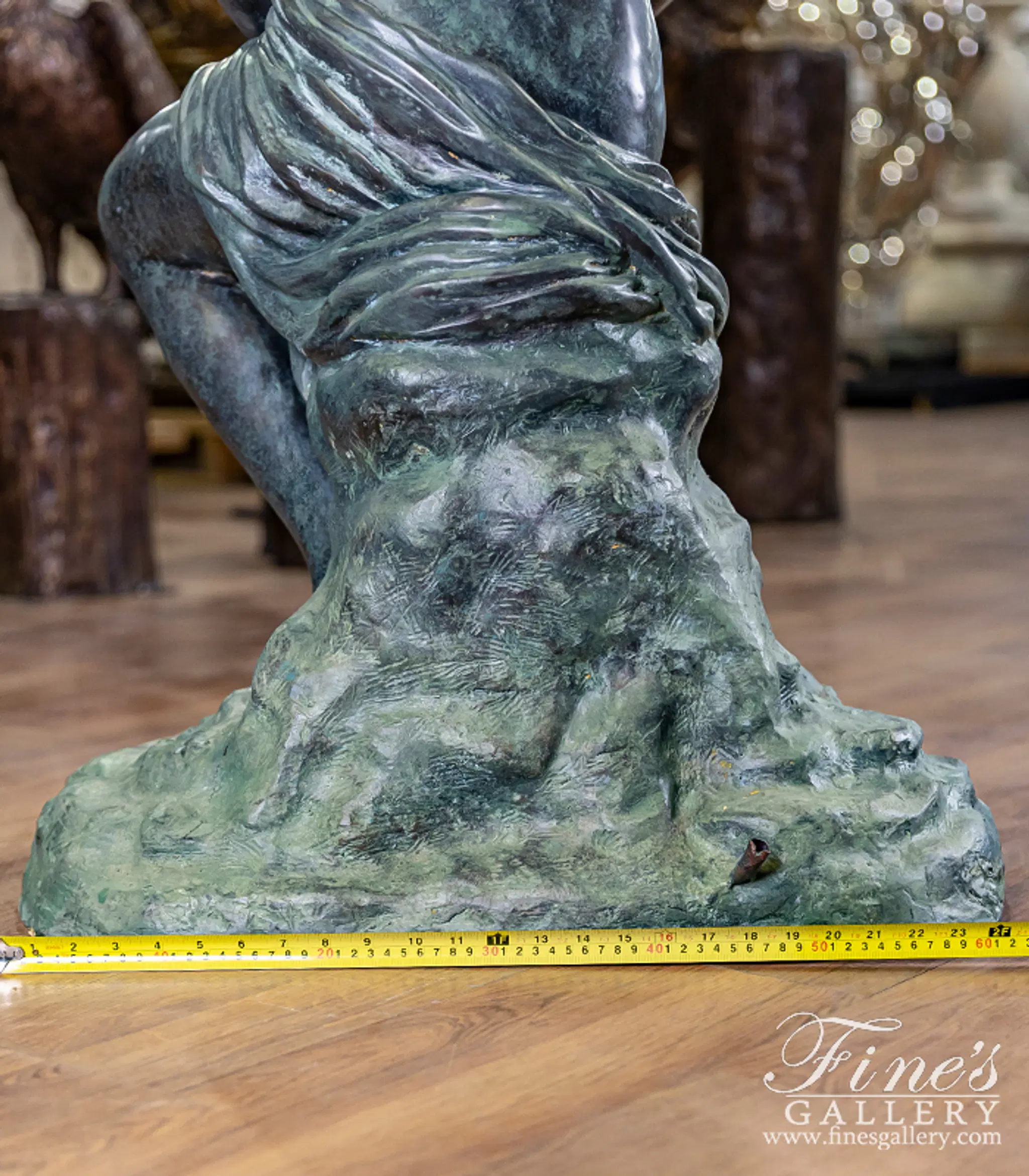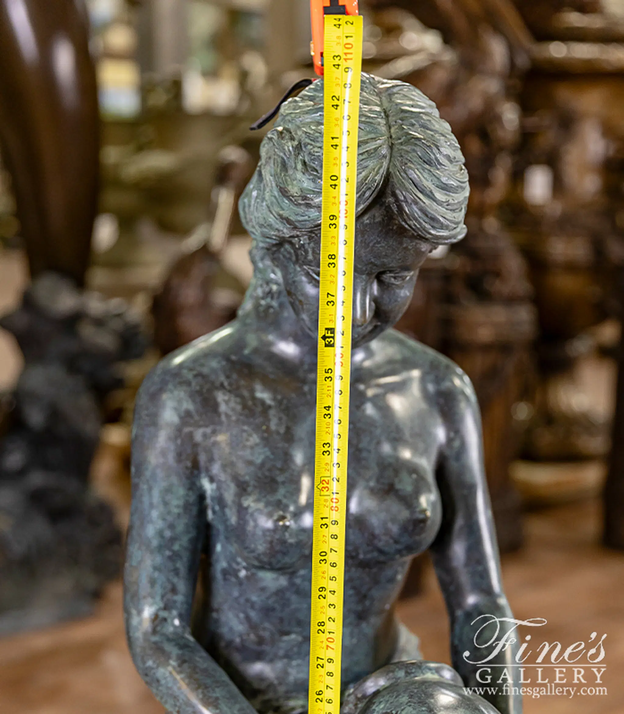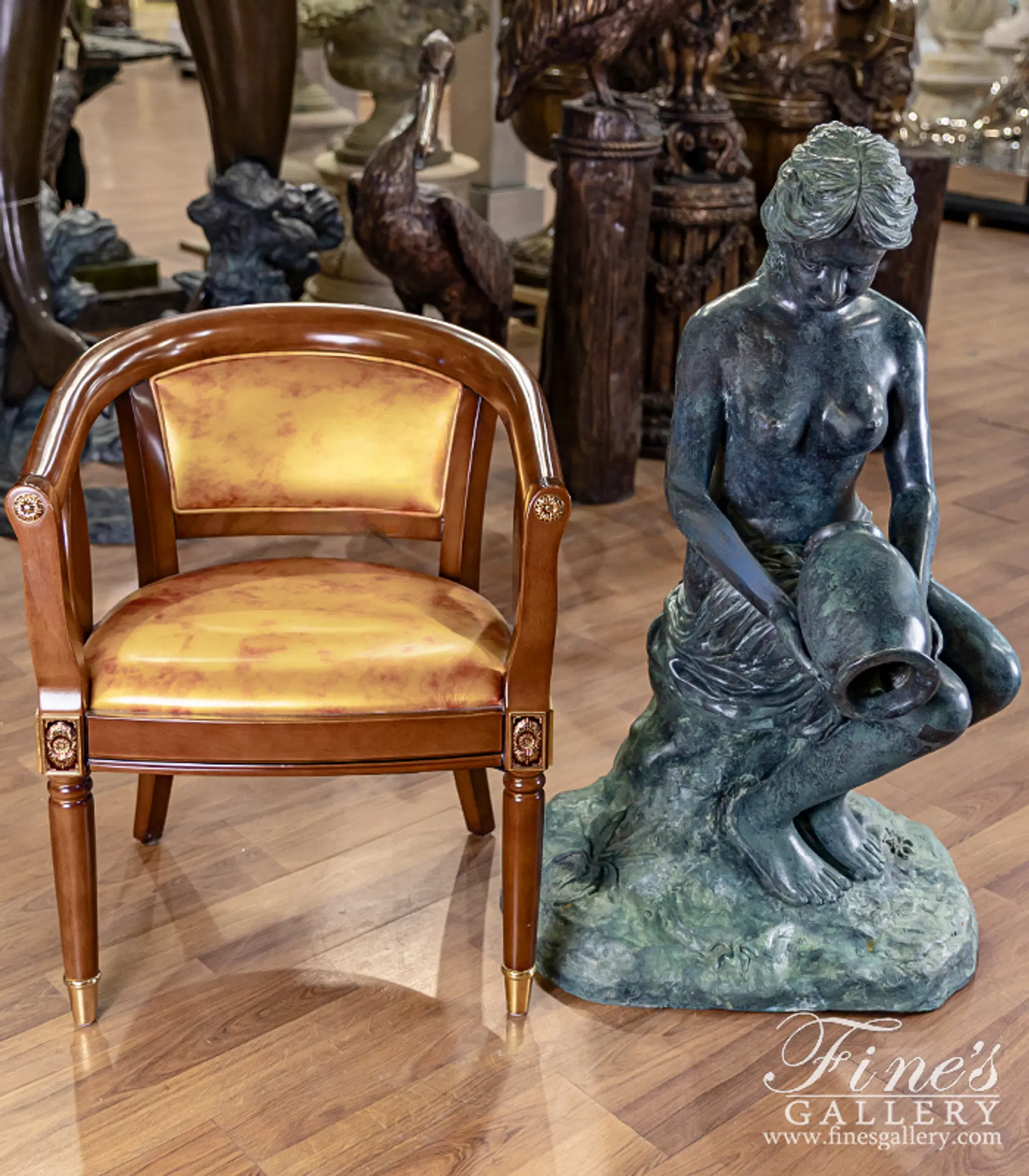 Sitting on a rocky centerpiece, a flowing garment gathered about her, she gracefully pours water from an ancient jar. Lost wax cast in Patina Bronze, we're proud to offer this quality piece for your very own private collection. The maiden bronze fountain.