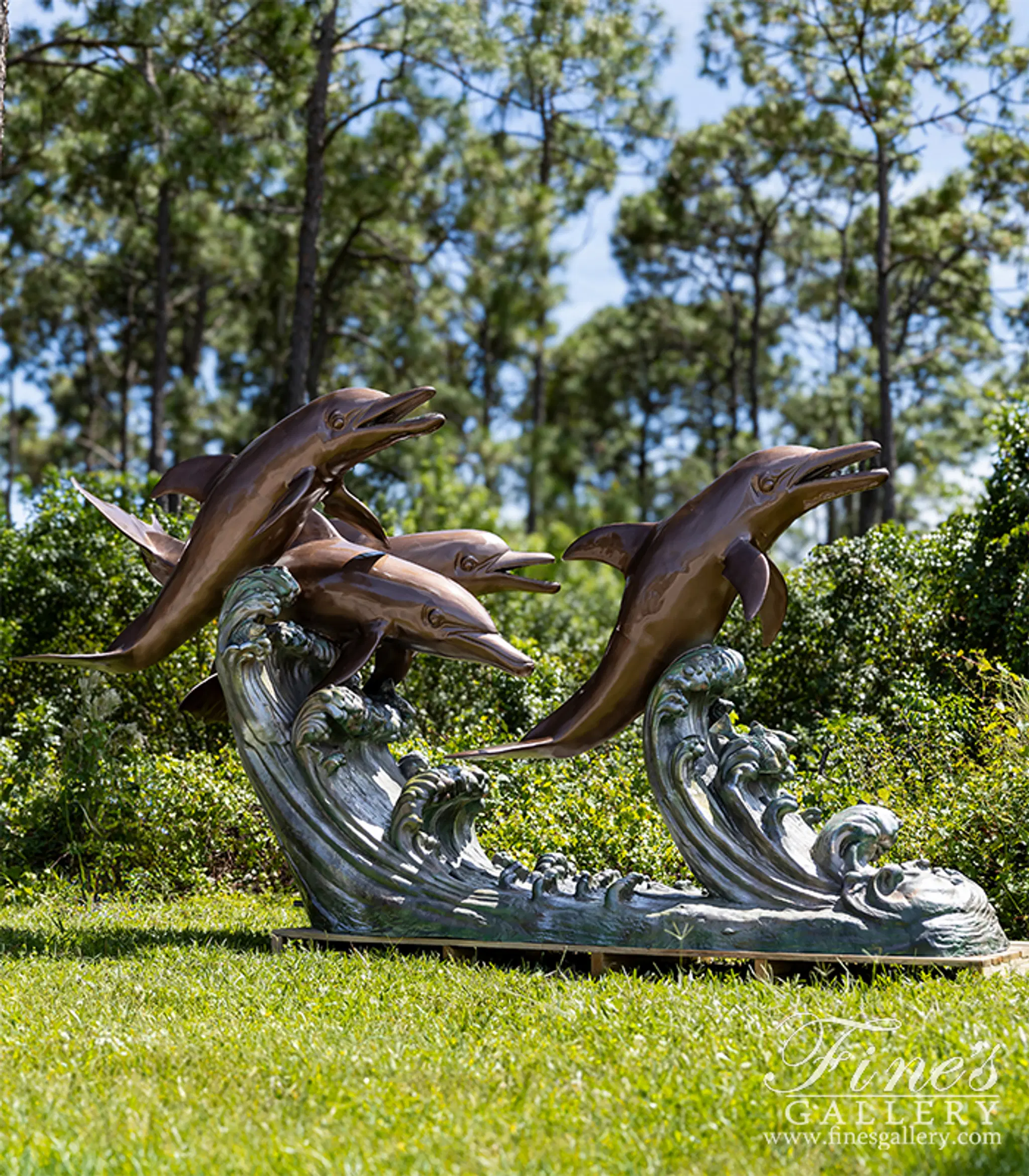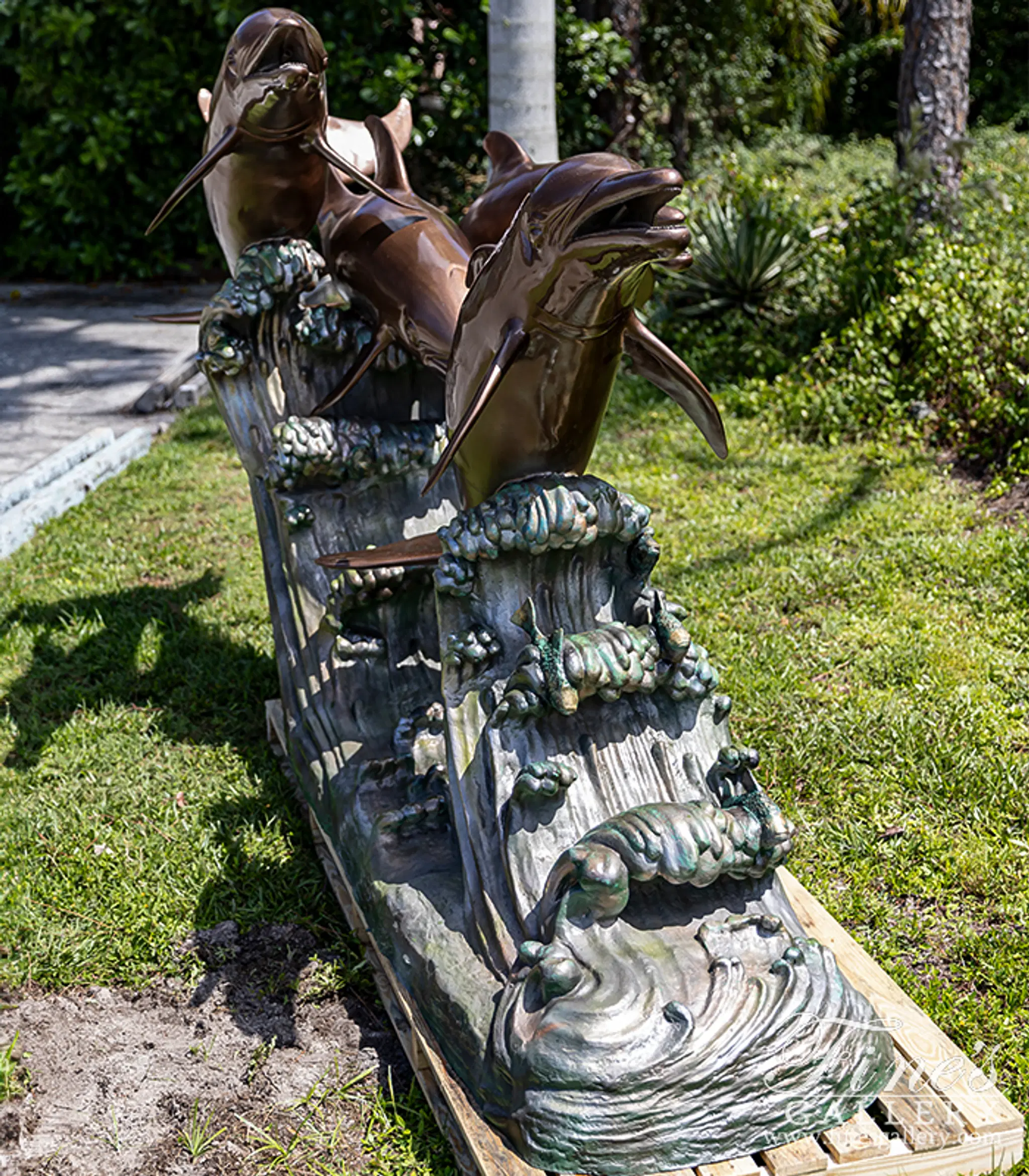 Spectacular oversized bronze happy dolphins frolic on the crest of waves in this delightful fountain.