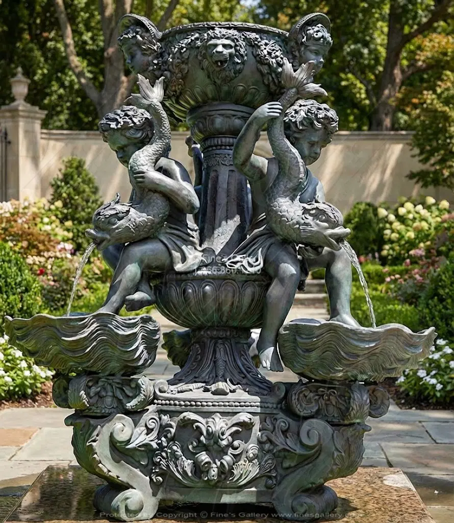 This rare bronze fountain will be one to treasure for years to come. A museum quality masterpiece, indeed. Water flows from the top finial, lion heads, mythical fish and into three seashells which overflow to catch basin below. Marble basins available.
