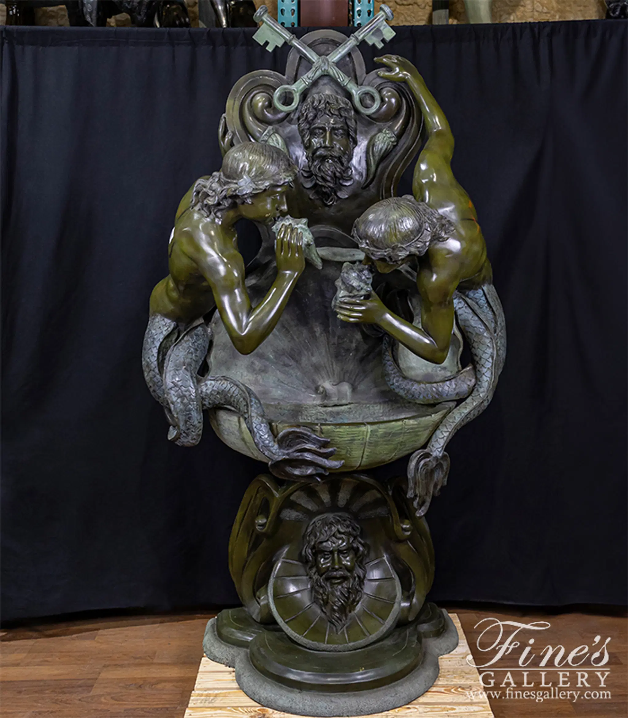 This is a beautiful Bronze Wall Fountain. Artistically designed and cast in Classic Bronze. Highly detailed mystical half human half fish creatures decorate this elaborate wall fountain. Vintage piece of roughly 25 years of age.