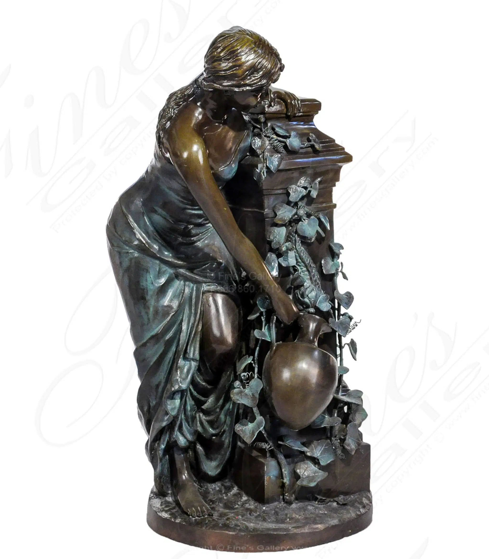 A Vintage Museum Quality Bronze Maiden and Vine Fountain. This center piece portrays a lovely young woman filling up her basin from a fountain decorated with winding vines. Roughly figured at 23 years of age, in new unused condition.