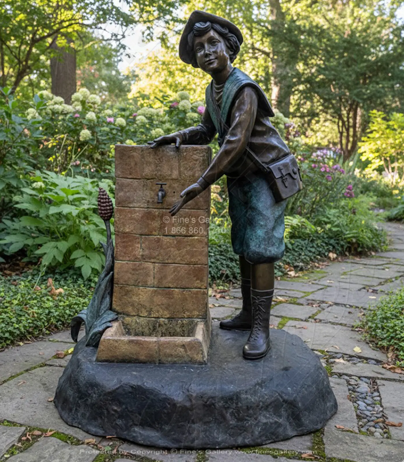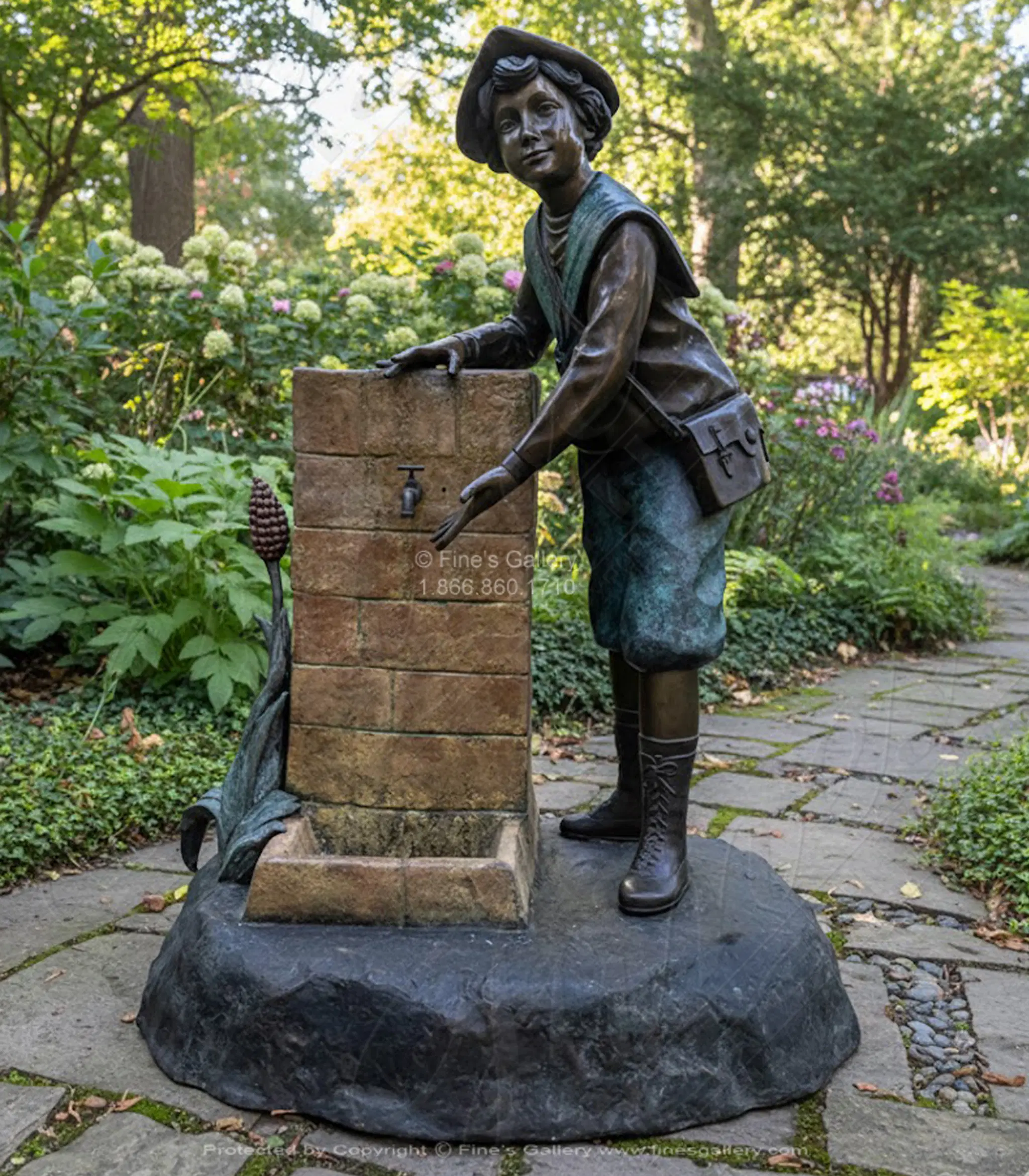 This lovely bronze fountain depicts a young colonial boy playing with water from an outdoor watering source. Molded out in a wondrous patina color for lasting beauty. Contact us today for personal sales assistance.
