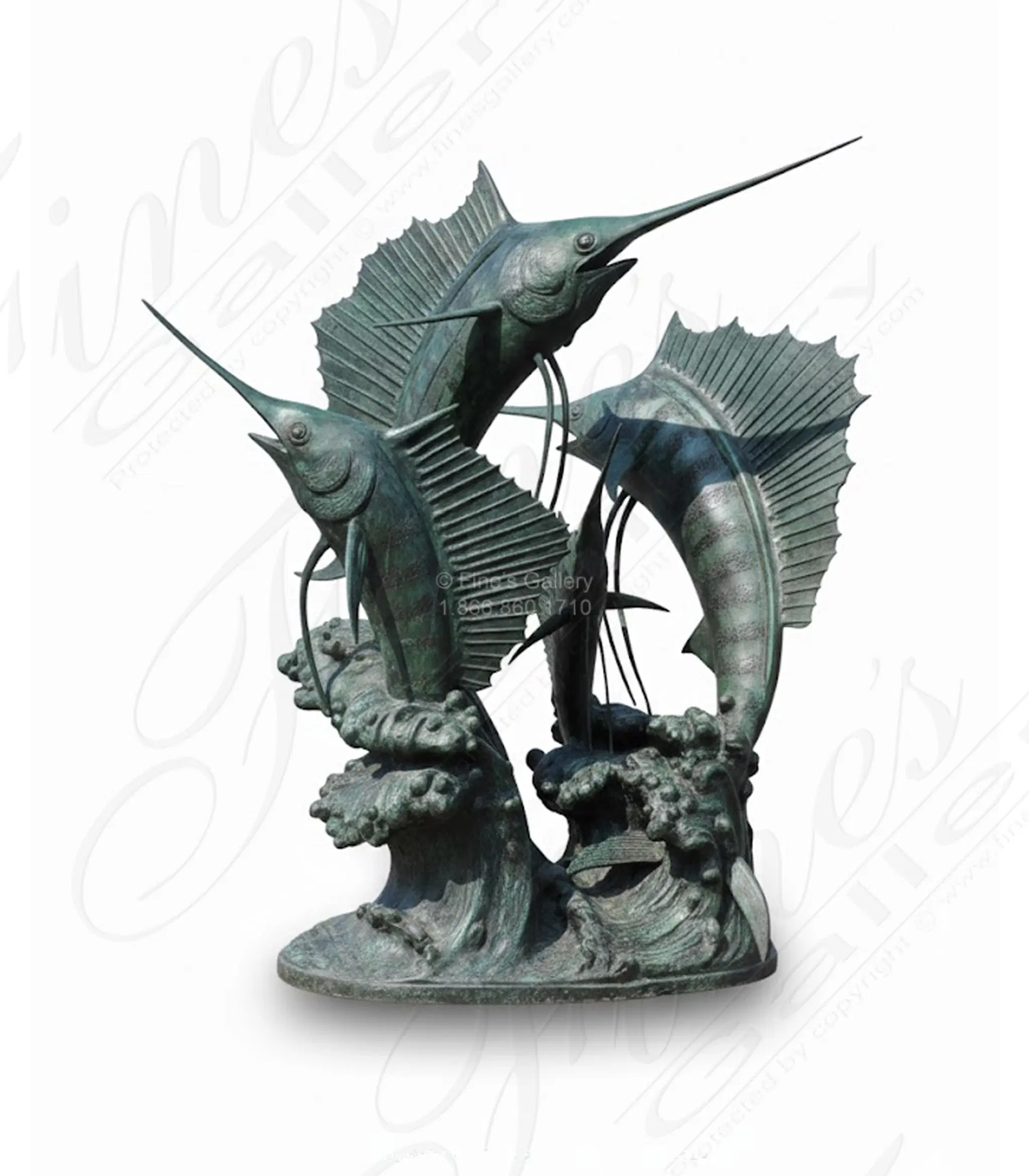 Elevate your outdoor space with this stunning Three Marlin Bronze Fountain, featuring incredibly realistic leaping marlins with water flowing from their mouths. Meticulously crafted in durable bronze, this eye-catching sculpture showcases the marlins' distinctive sword-like noses and large fins in dramatic motion. Perfect as a centerpiece for gardens, patios, or commercial spaces, this artistic water feature combines natural beauty with sophisticated craf