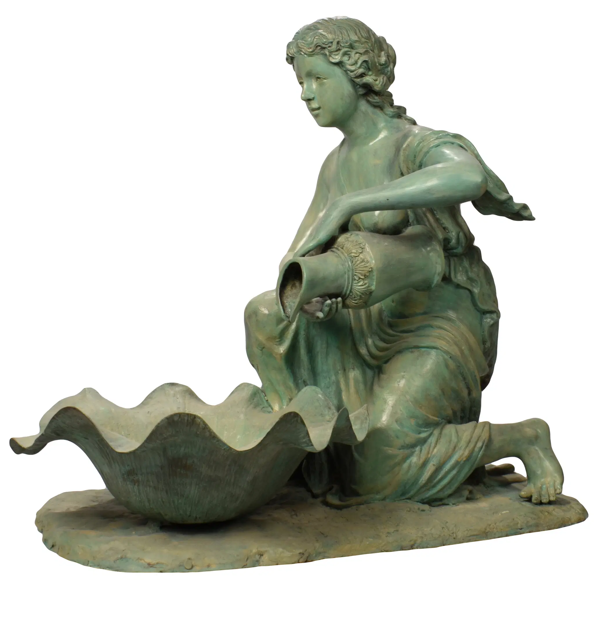 A maiden pours water into a scallop-shaped basin in this Antique Patina Bronze fountain. Notice the fine detail in the two perspectives shown. Ornately detailed and cast in bronze by skilled artisans, this fountain makes a beautiful display.