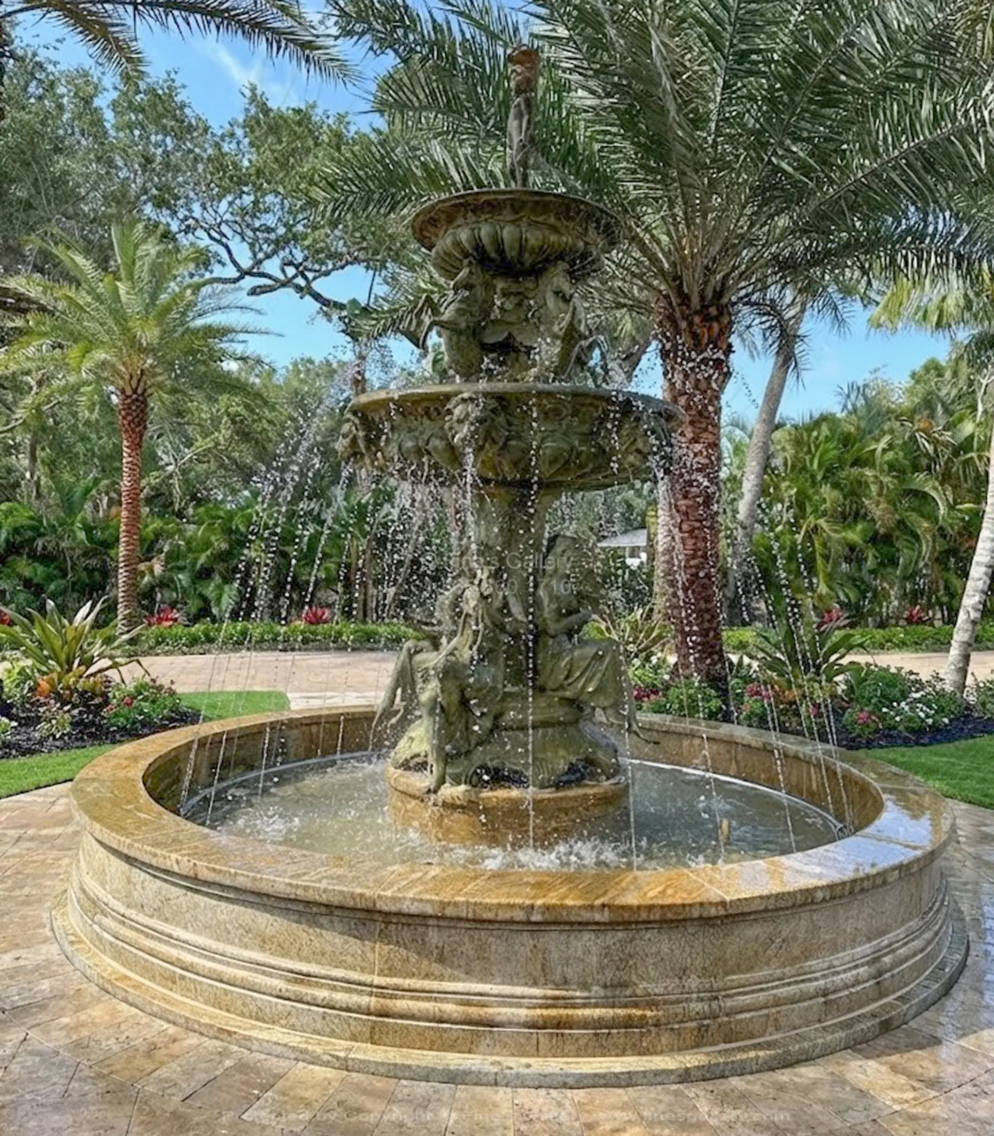 The Grandeur Two Tier Bronze Fountain Greco Roman style is cast in Patina Bronze. A mixture of artistically designed females, horses, lions and children adorn this unique Pedestal Fountain. Natural stone pool sold separately.