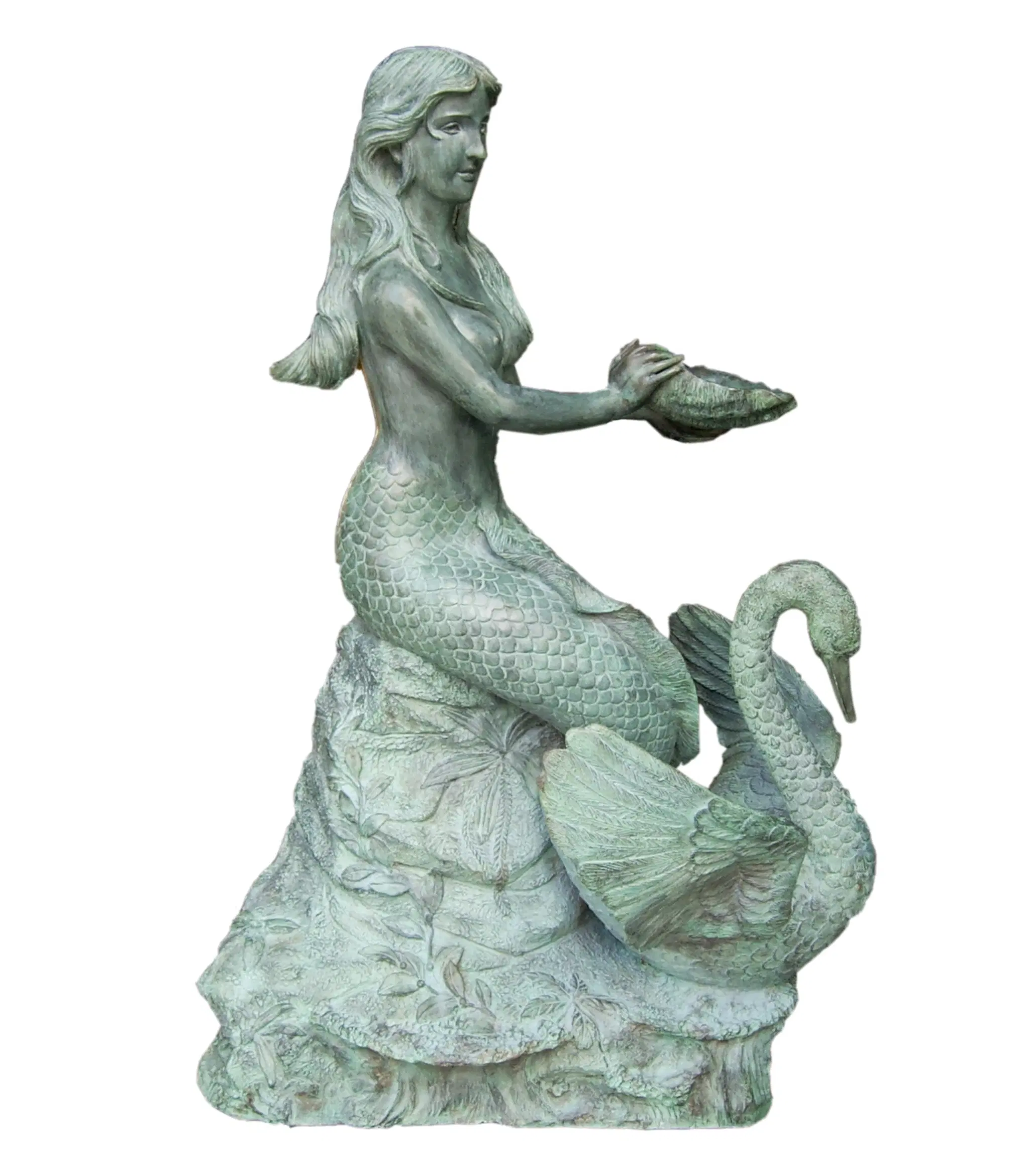 A beautiful mermaid fountain rests on a rocky slop to shower a?lovely?swan with a large sea shell. Made from green patina bronze, this fountain?displays exquisite detail in an elegant portrayal of these graceful creatures.