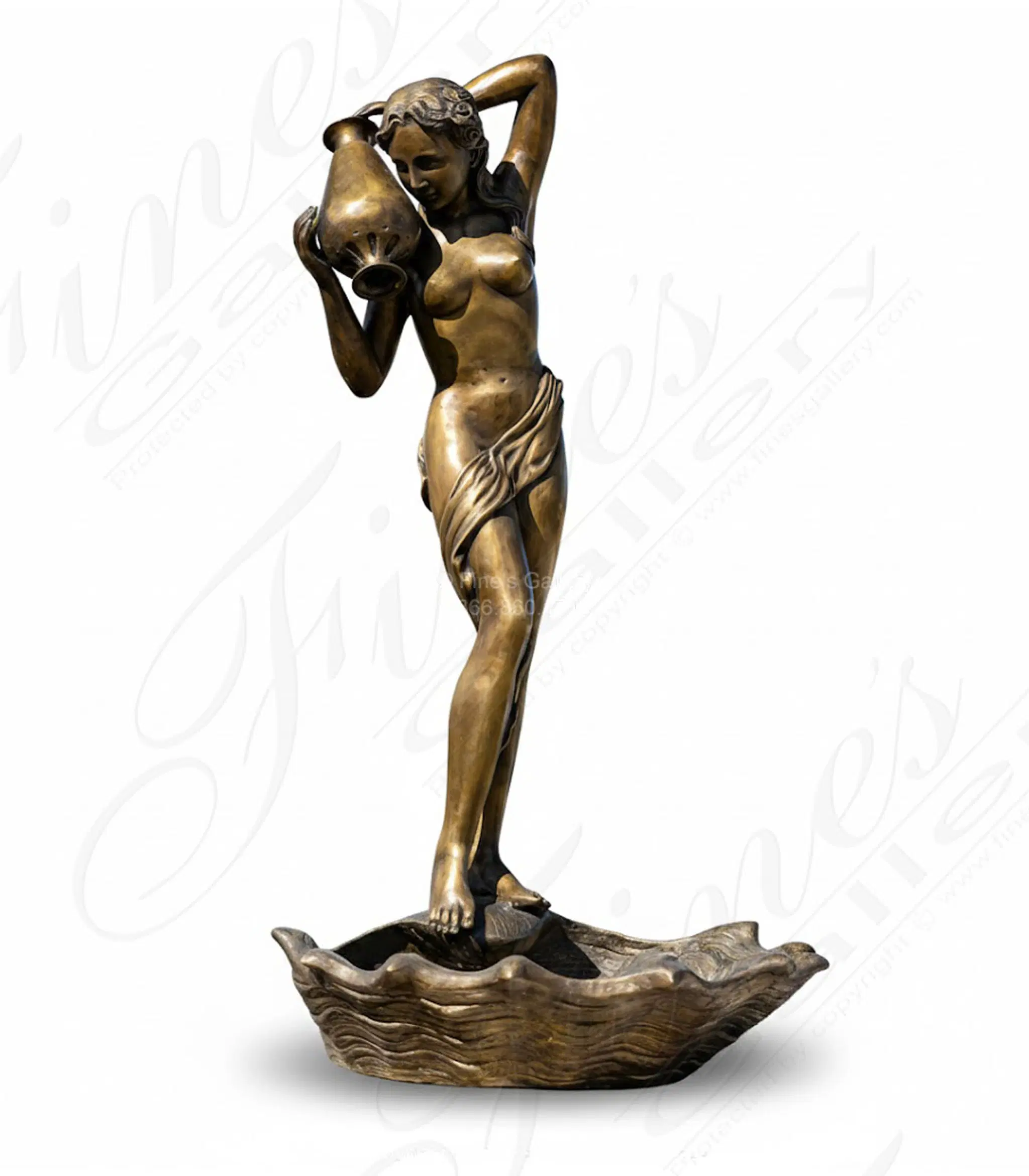 Standing in a giant clam shell, this half nude beauty pours a relaxing stream of water from her large vase. Excellent craftsmanship is detailed within this magnificent type of bronze.