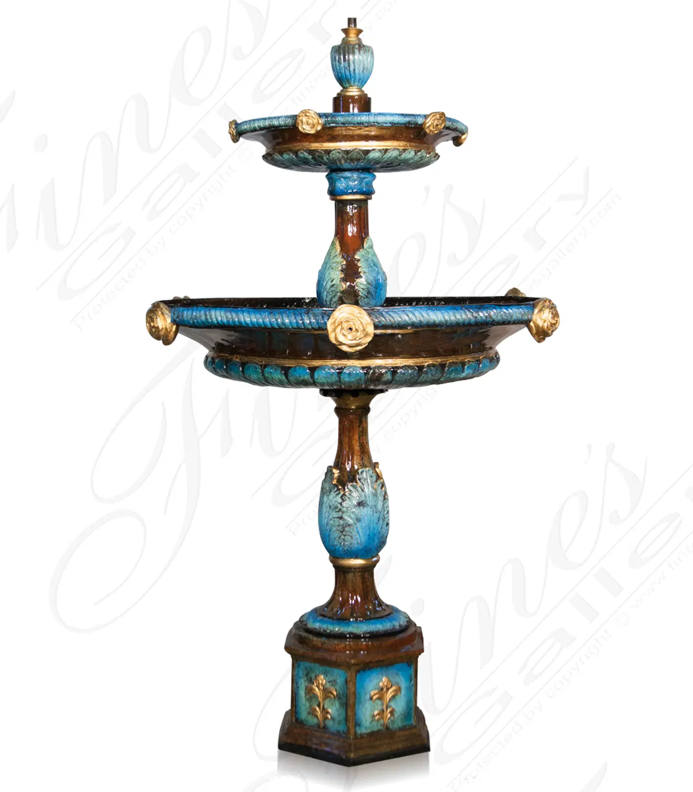 A two tiered bronze fountain featuring enamel finish and roses. 63 inches tall by 37 inches in diameter with a 15 inch footprint.