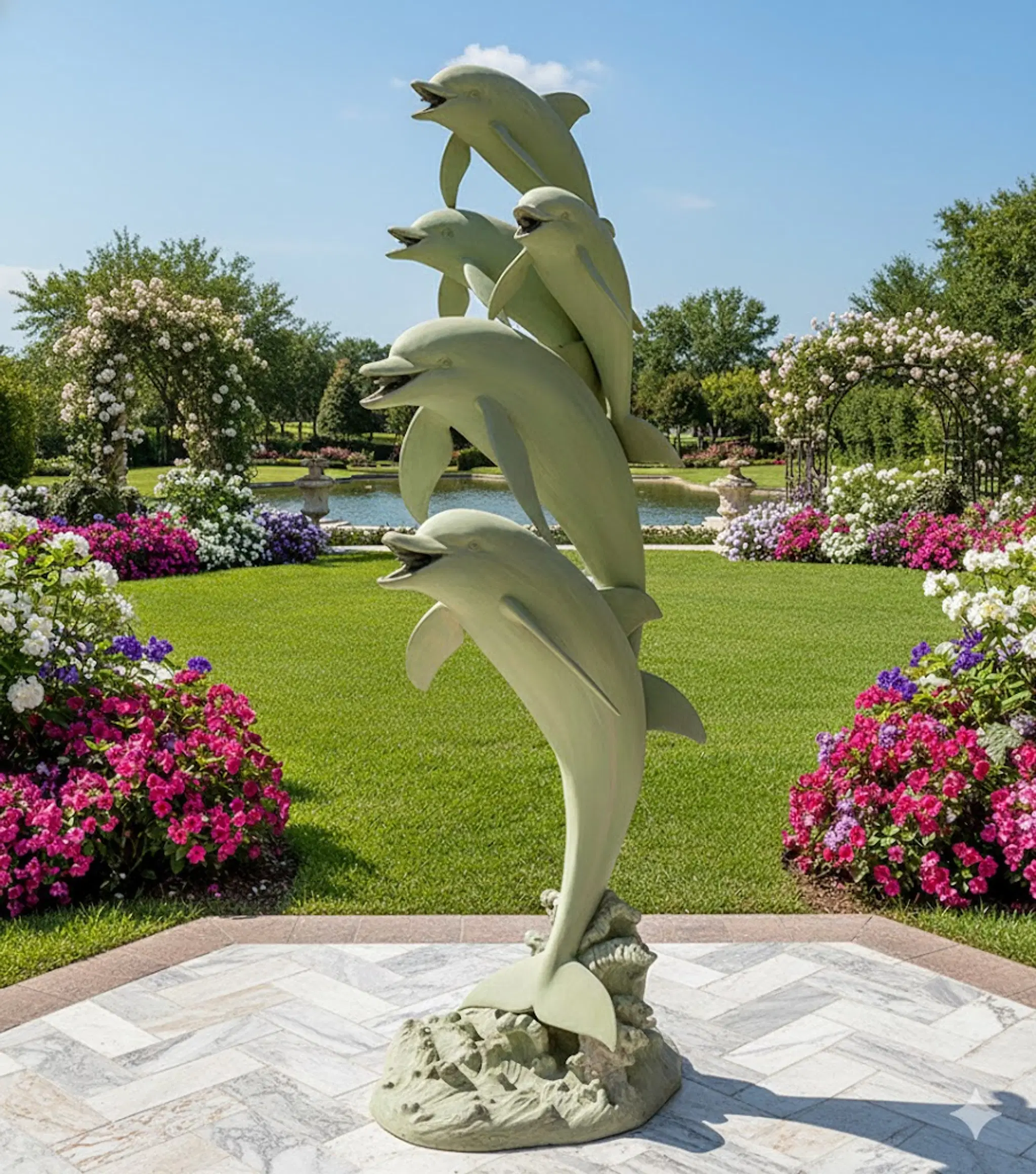 Antique Patina Five Dolphin Fountain Feature. Optional catch basin and commercial stainless water ring, available sold separately.
