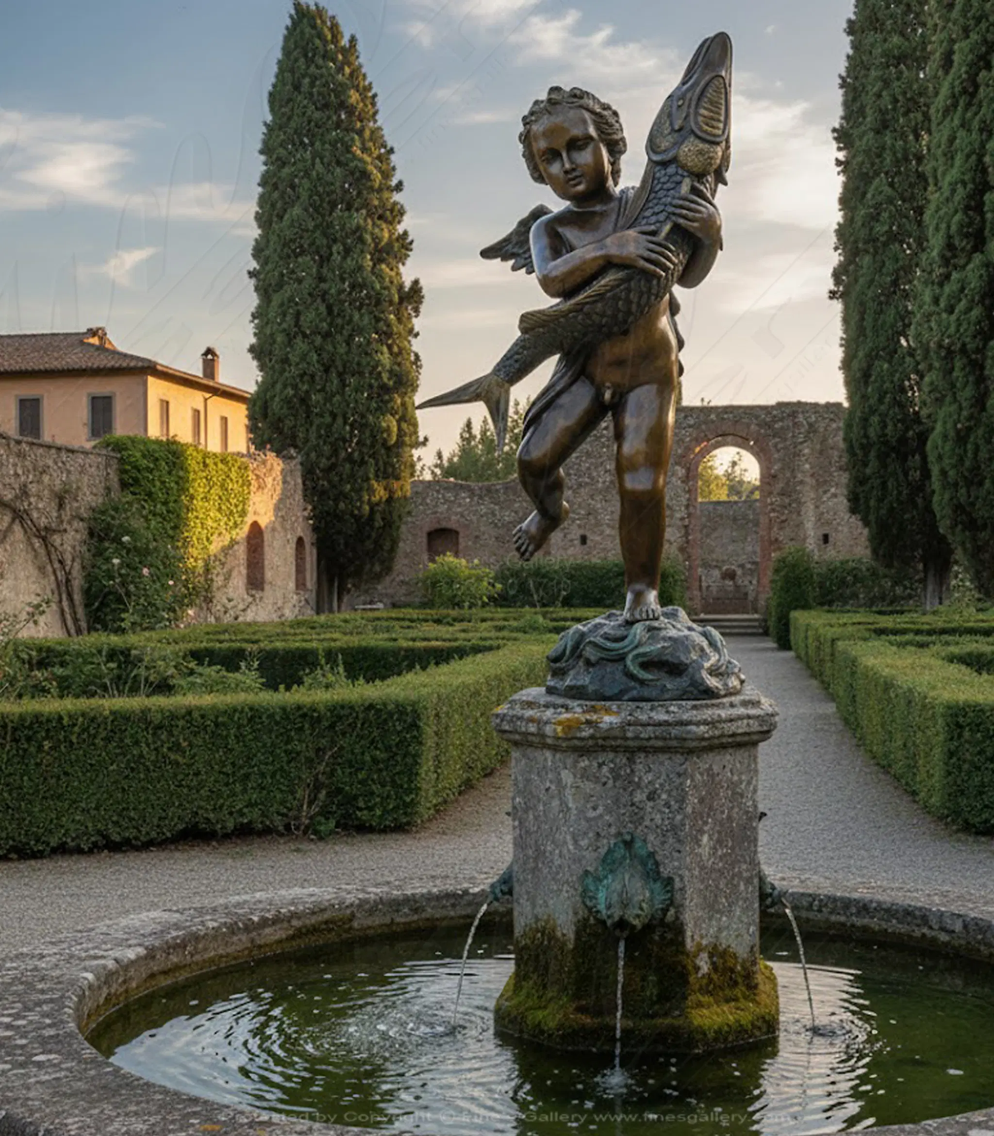 Bronze Cherub with Fish Fountain Finial - Elegant Garden Water Feature - Outdoor Decor