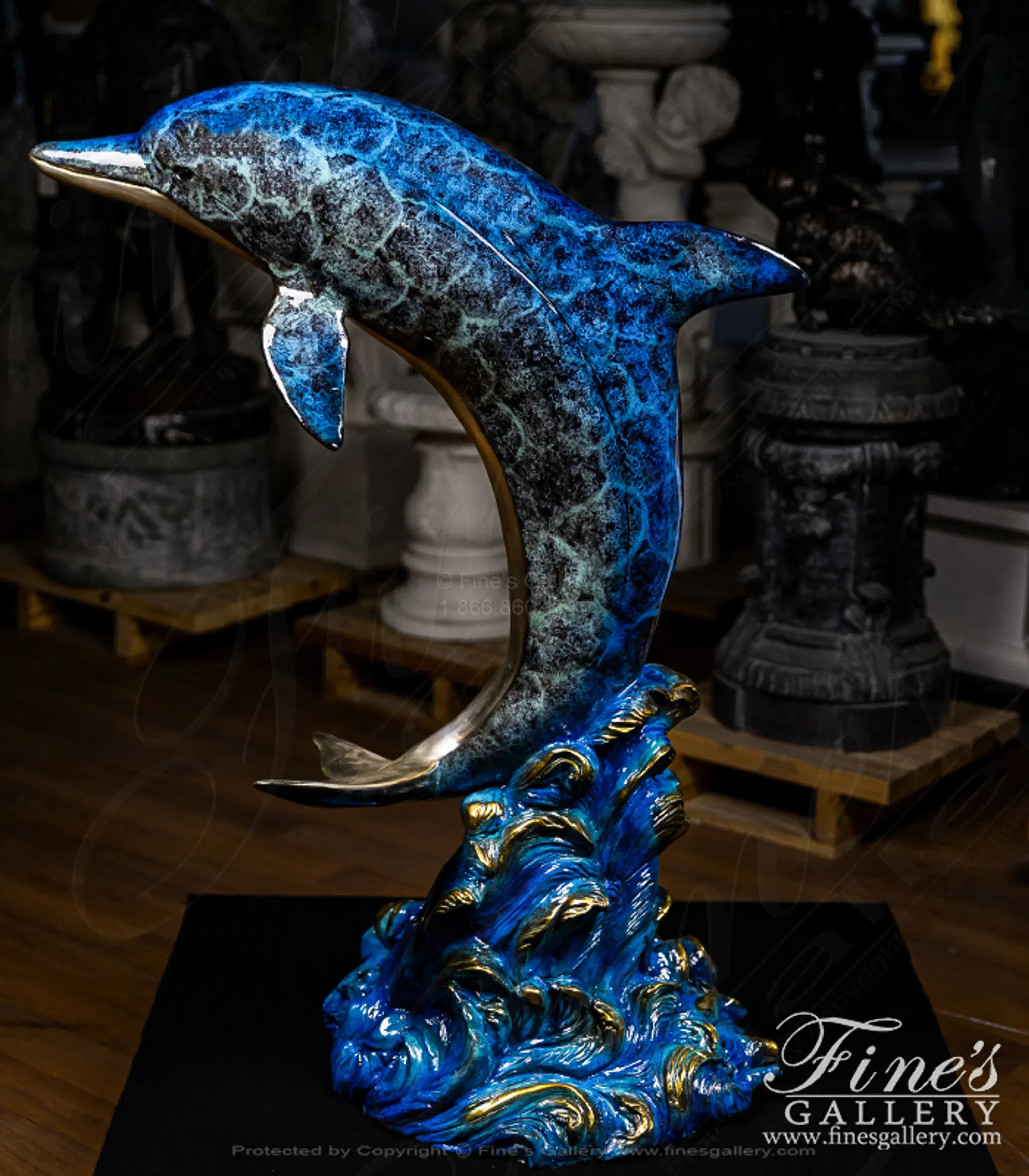 Single Bronze Dolphin Fountain. Finished in a luxurious and brilliant enamel finish. This is a fountain that is commonly installed next to the swimming pool. Ask about our marble pool basin options as well starting at 60 Inch in diameter.
