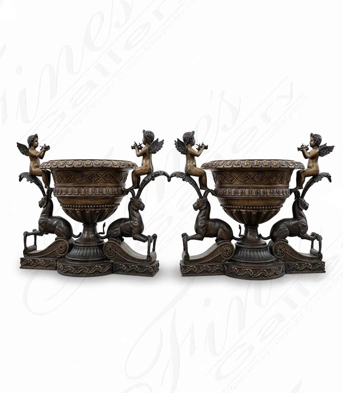 Elevate your garden or indoor space with our exquisite Bronze Mythical Cherub Planter. This luxurious ornamental piece features intricate silver-toned bronze craftsmanship adorned with golden cherubs, mythical animals, and classic Grecian details. Each planter showcases meticulous artistry, creating a stunning decorative accent that combines elegance with timeless design. Perfect for displaying your favorite plants or as a standalone statement piece in any sophisticated home décor arrangement.