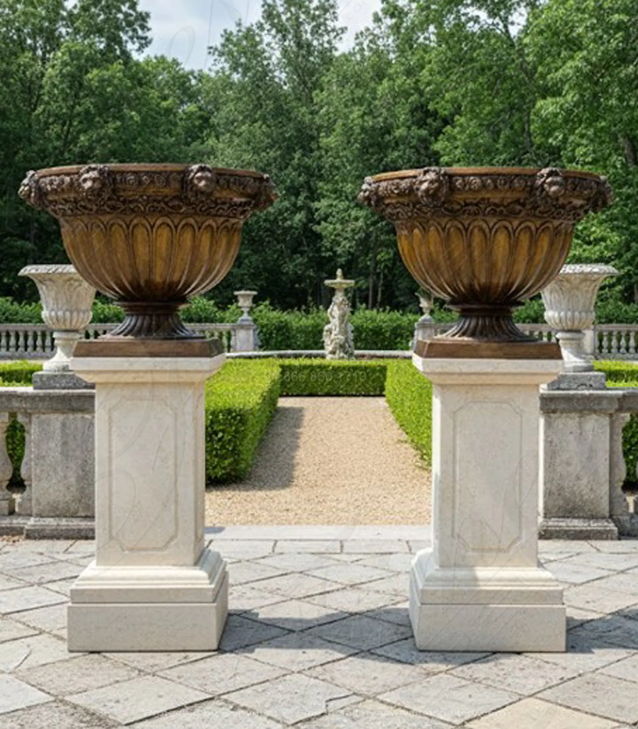 Handcrafted Bronze Majesty Ornate Classical Planter Pair - Elegant Garden Decor with Beautiful Bronze Finish - Sculptural Decorative Planters for Indoor or Outdoor Use - Light Cream Marble Pedestals Available Separately - BP-1185