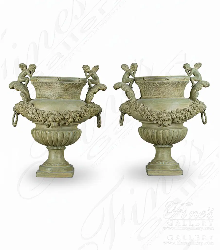 Cherub Lion Planter Pair in antique patina finish. Featuring floral rose garlands, winged cherubs and ring mouthed lion heads. Priced as a pair! Light Travertine pedestal pair available sold separately.