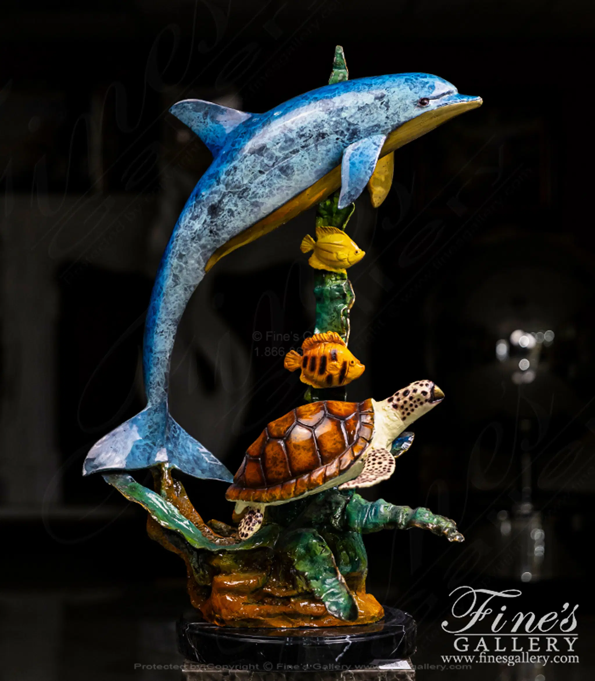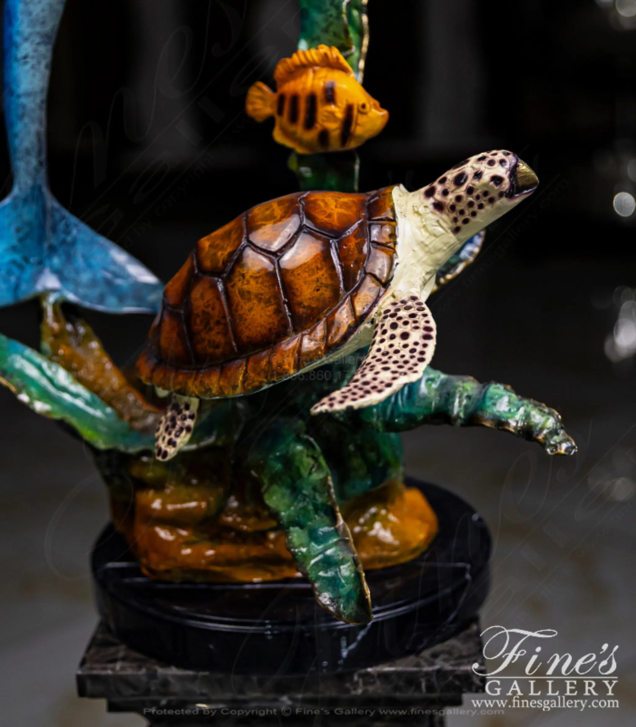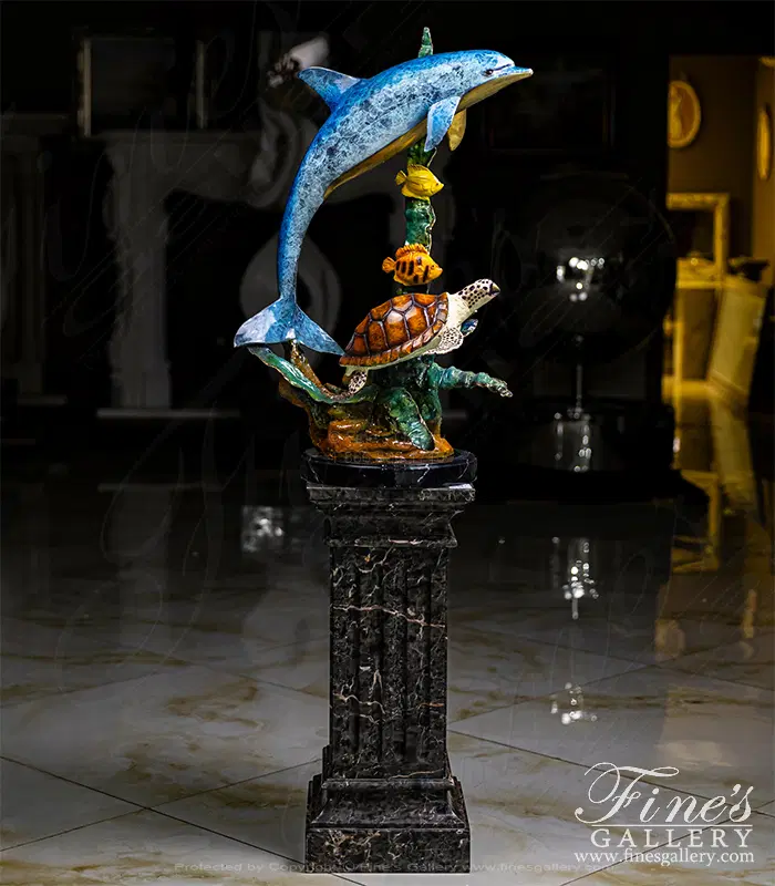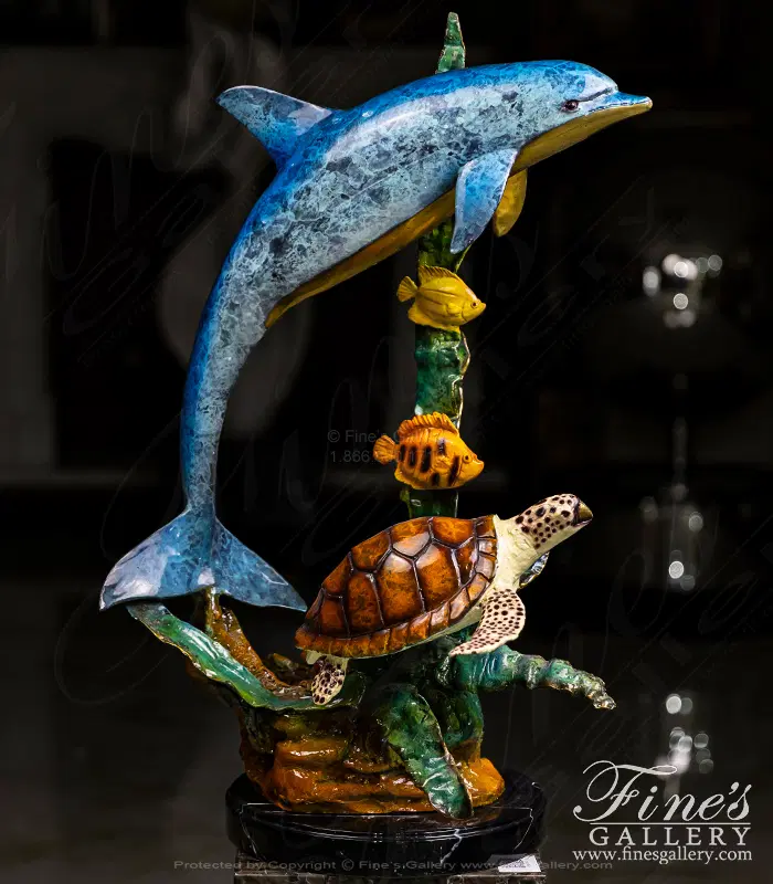 Bright colors of the sea are shown off here featuring a dolphin several fish and a sea turtle. This sculpture is hand made and poured in Bronze! Bronze Dolphin Fountain