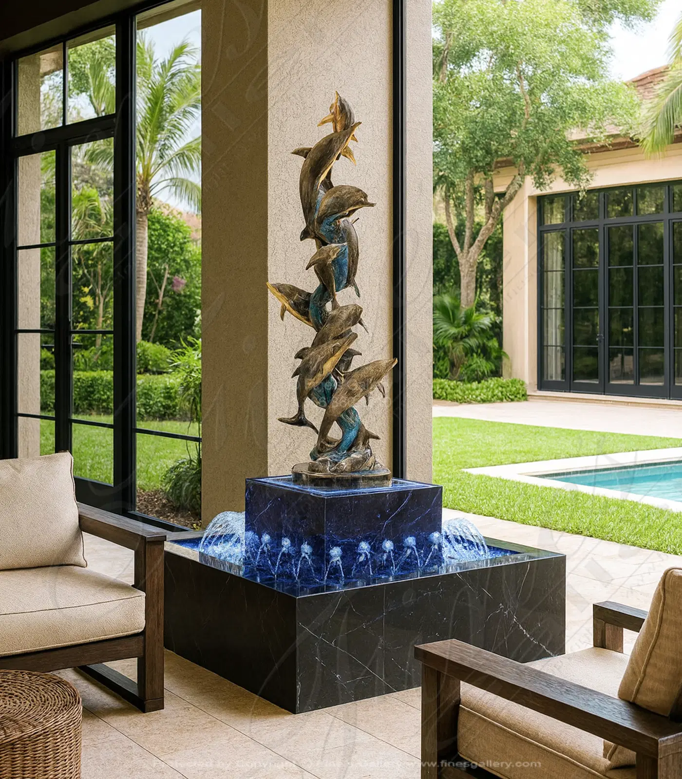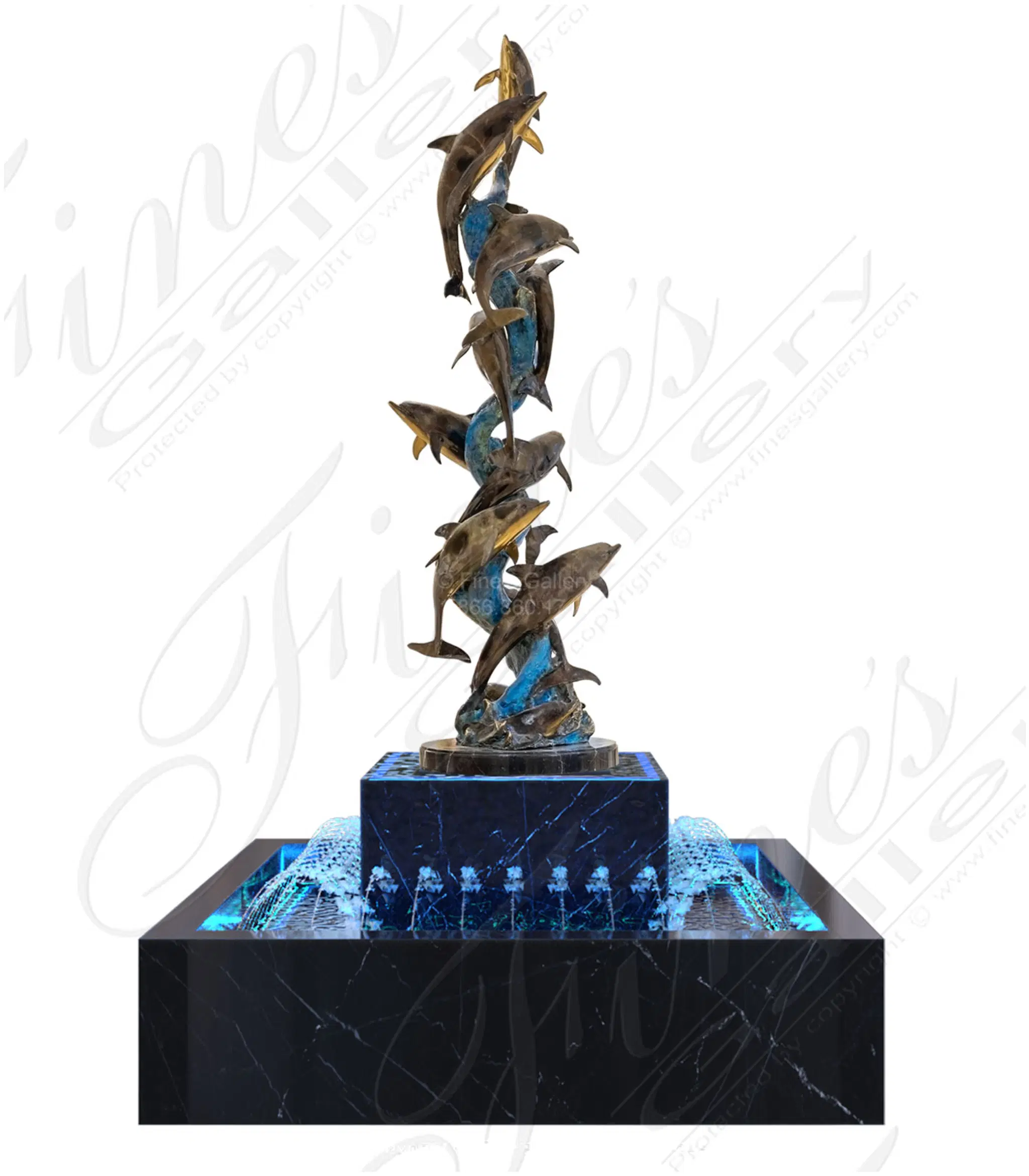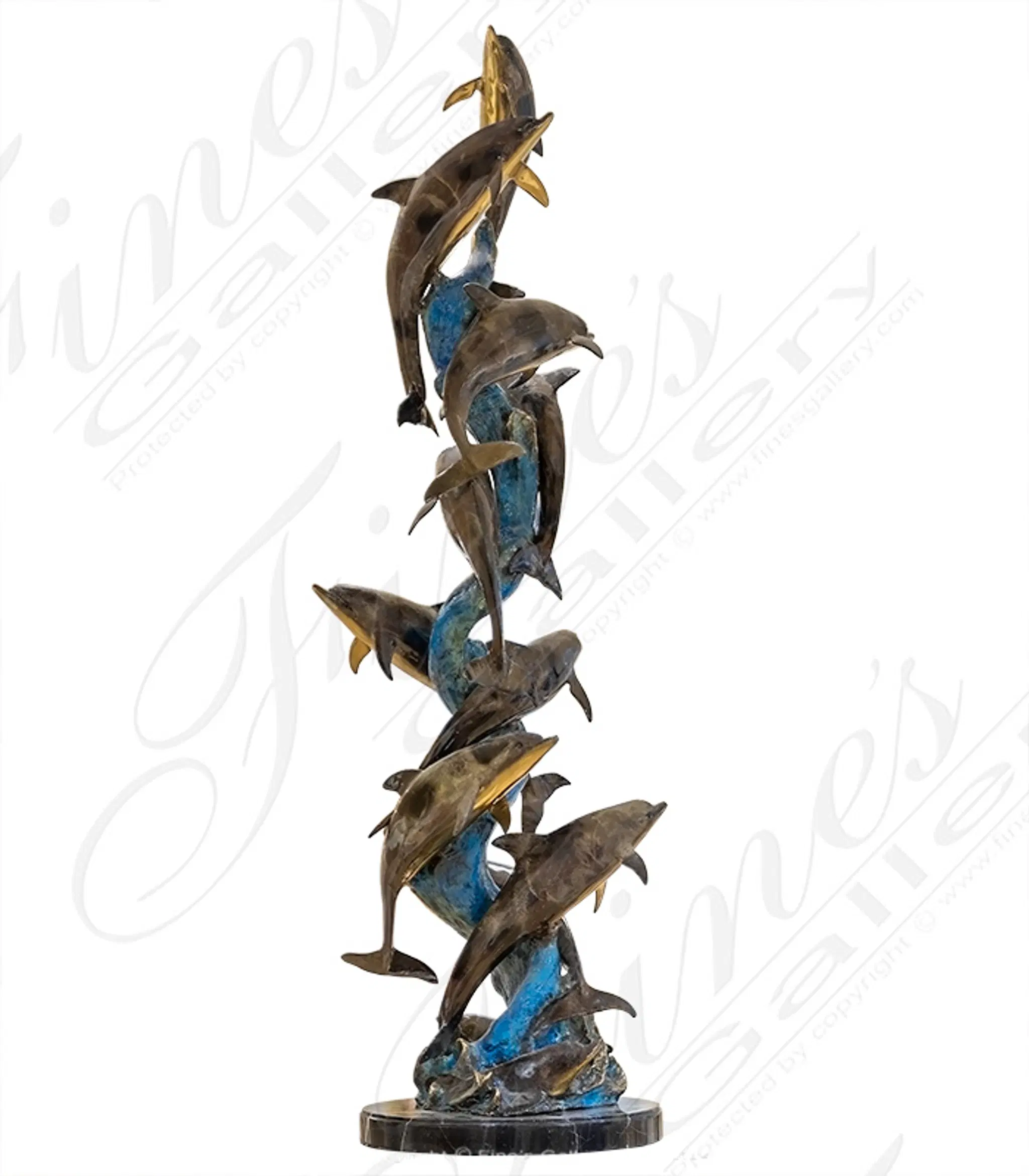 Social School of 11 Dolphins hand made from lost wax bronze and finished brilliant enamel. At just shy of 5 feet tall, this is perfect for interior or exterior. Nero Marquina marble catch basin available sold separately.