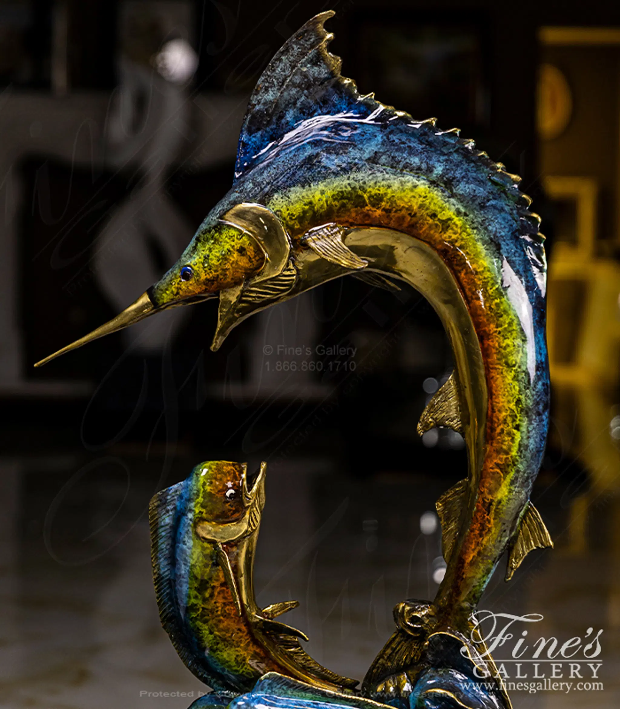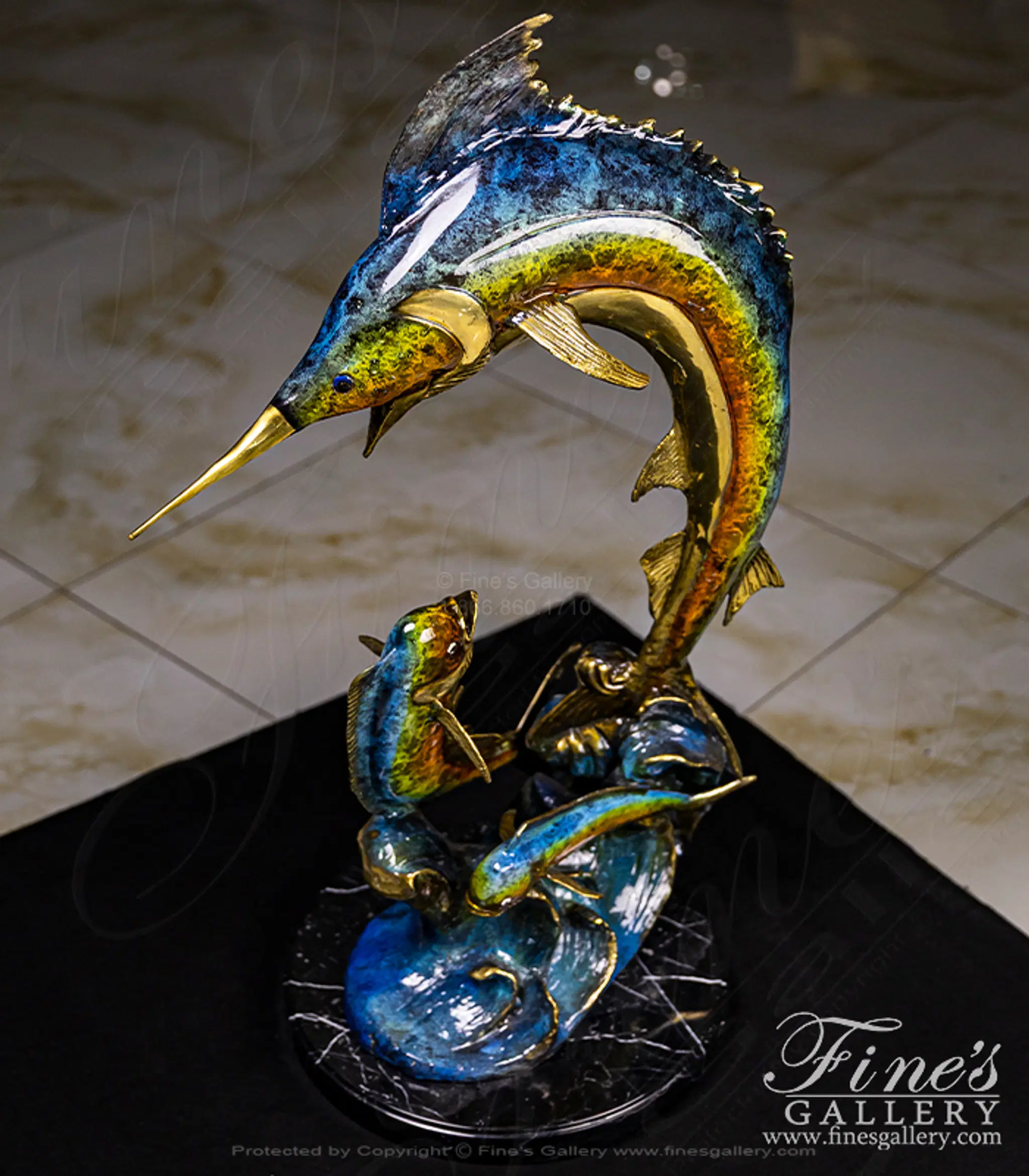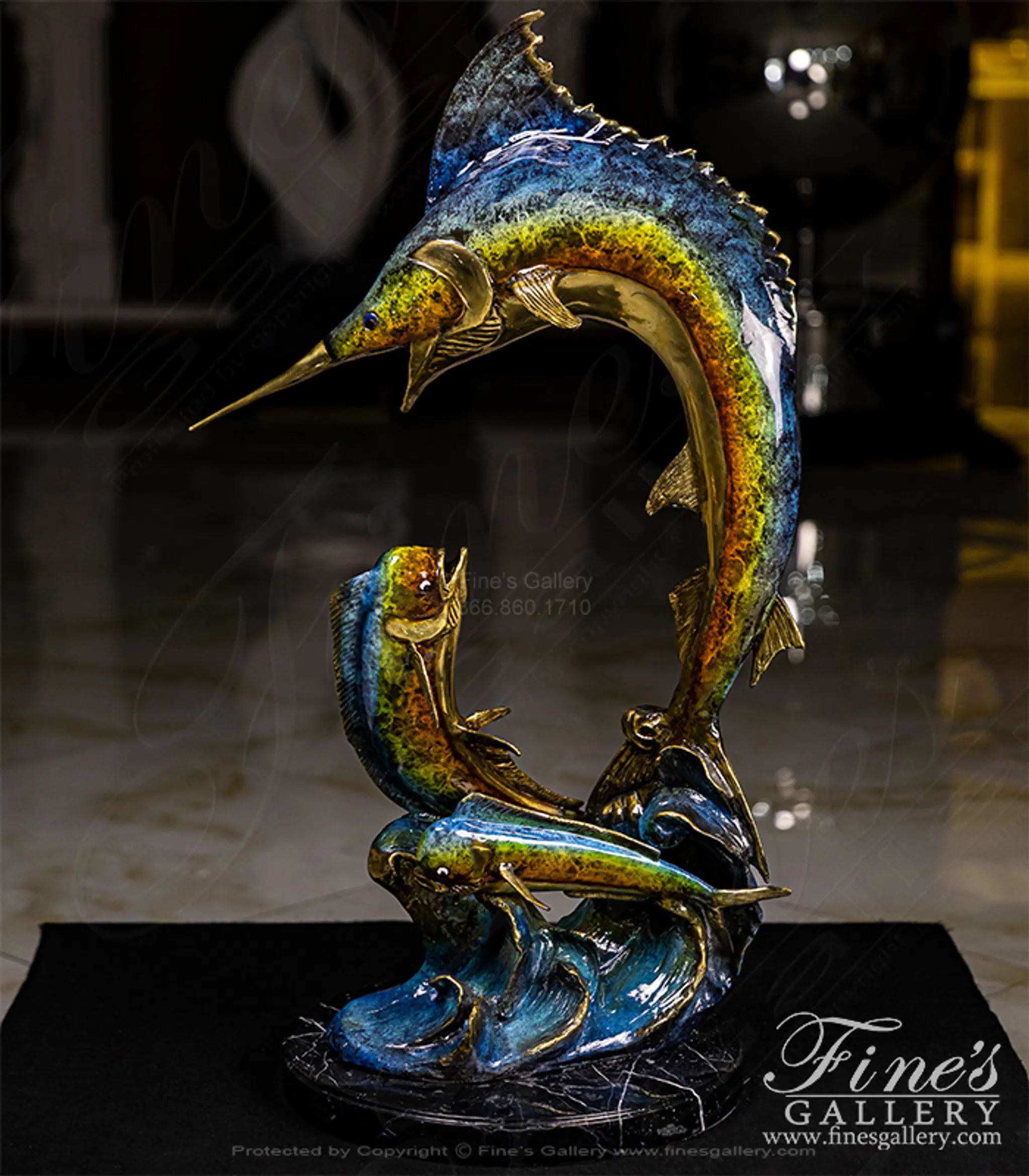 A brilliant colored bronze sculpture featuring a marlin and two smaller mahi mahi. The rich coloration and life life sculpting makes this a magnificent addition to your beach house trophy room.