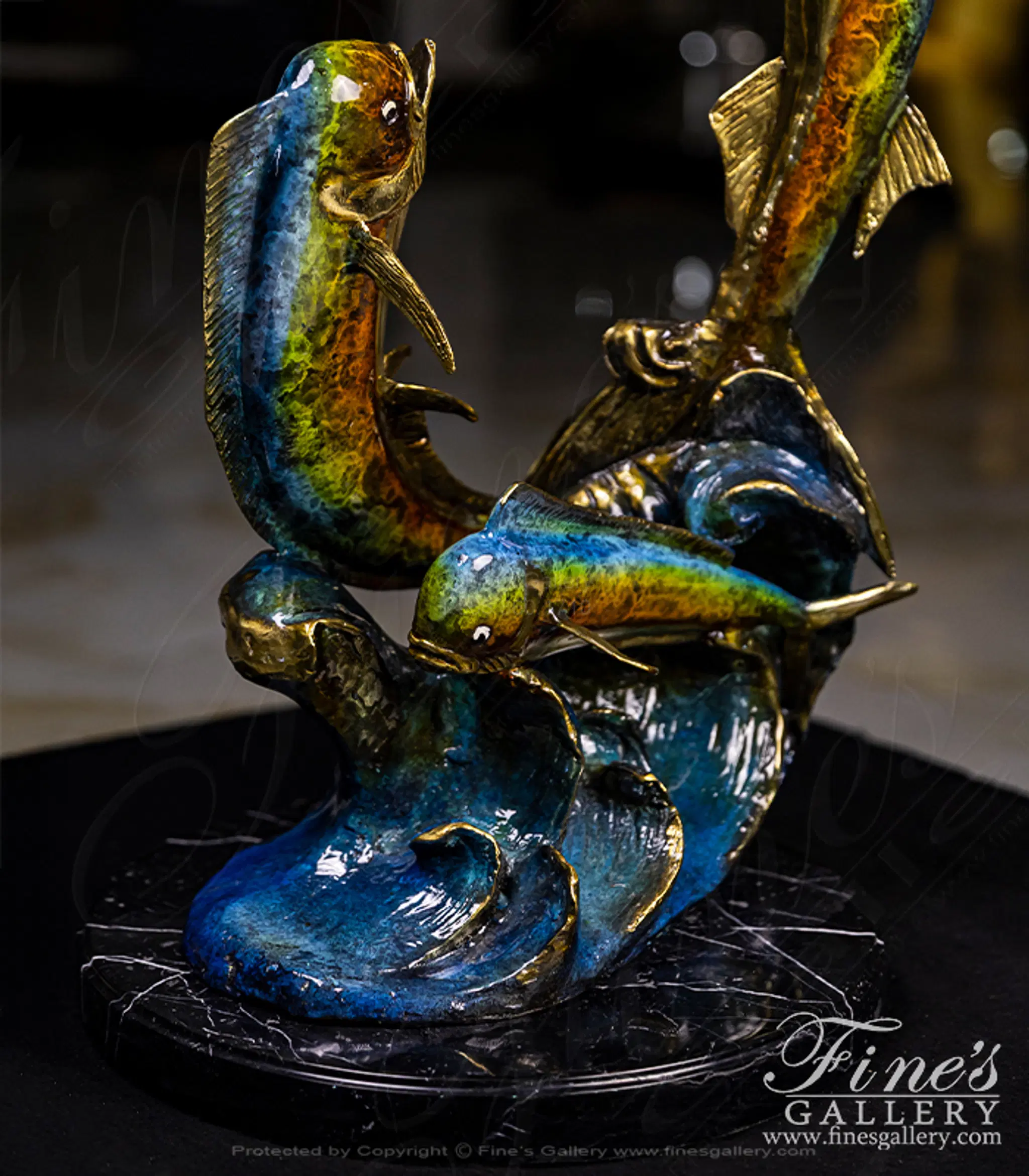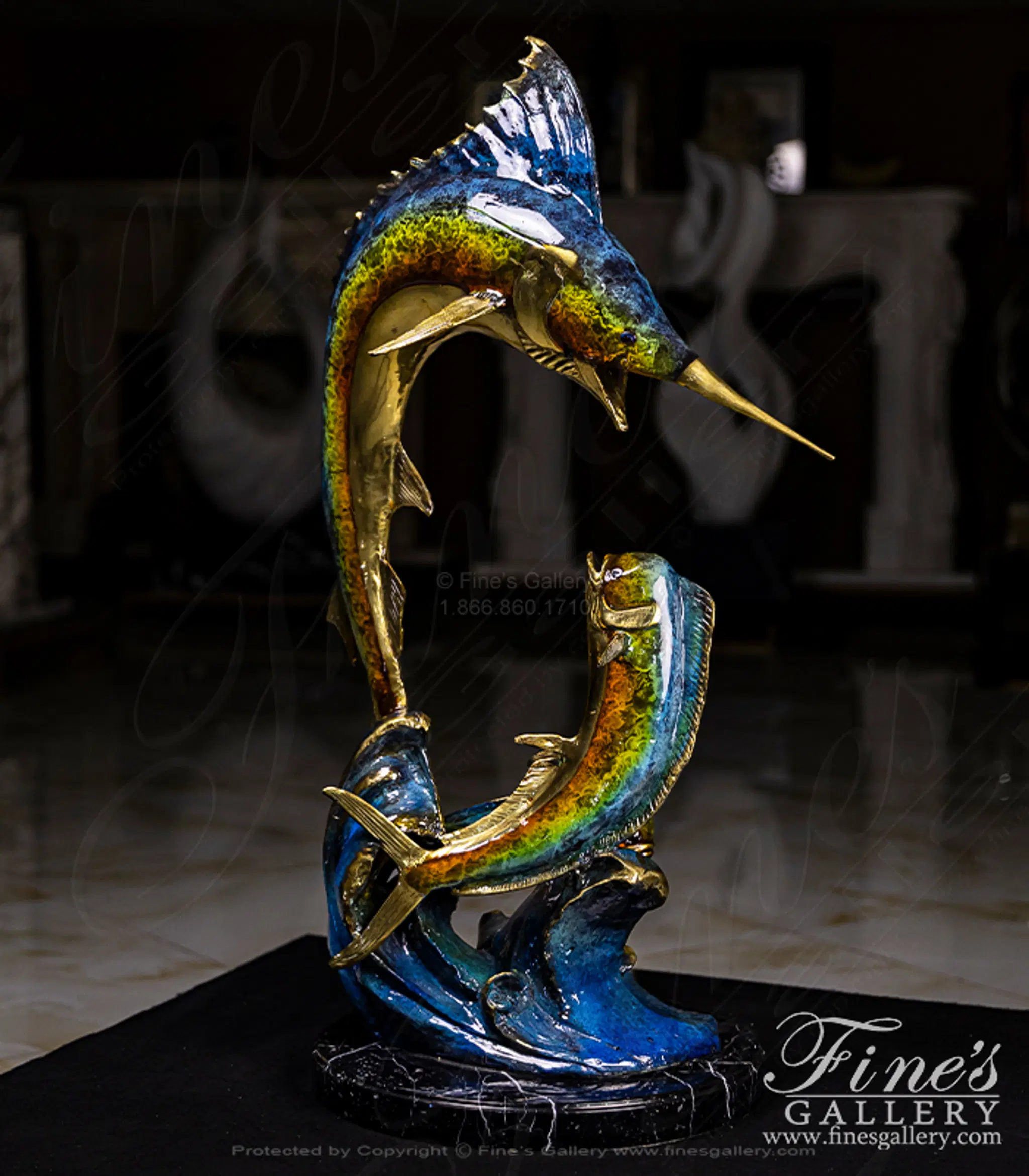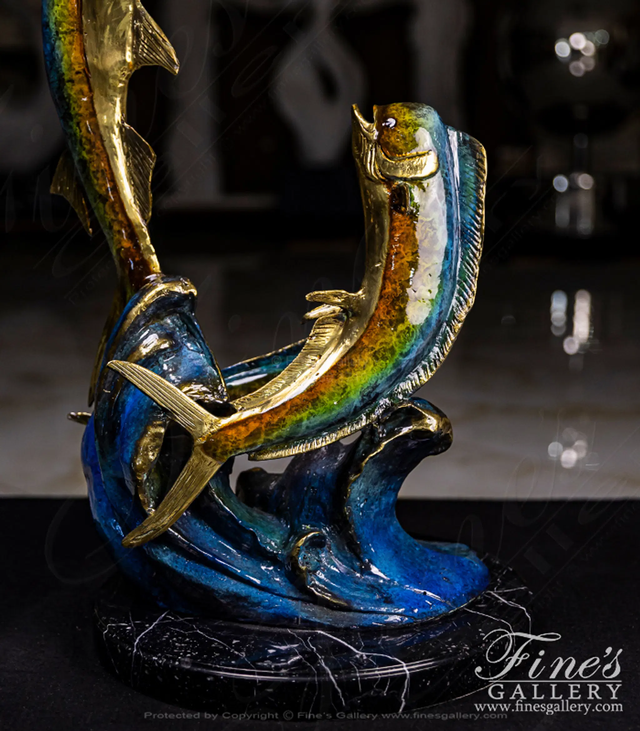A brilliant colored bronze sculpture featuring a marlin and two smaller mahi mahi. The rich coloration and life life sculpting makes this a magnificent addition to your beach house trophy room.