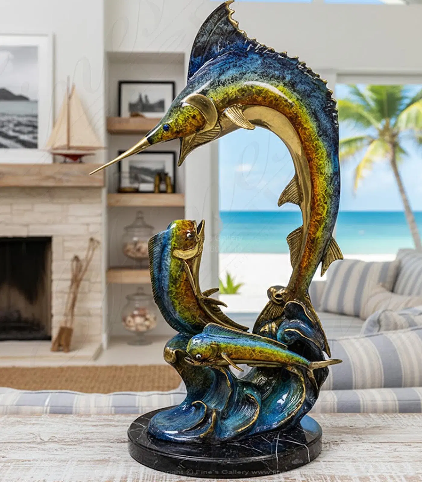 Marlin and Mahi Mahi Bronze Statue - Vibrant Coastal Marine Sculpture for Beach Home Trophy Room