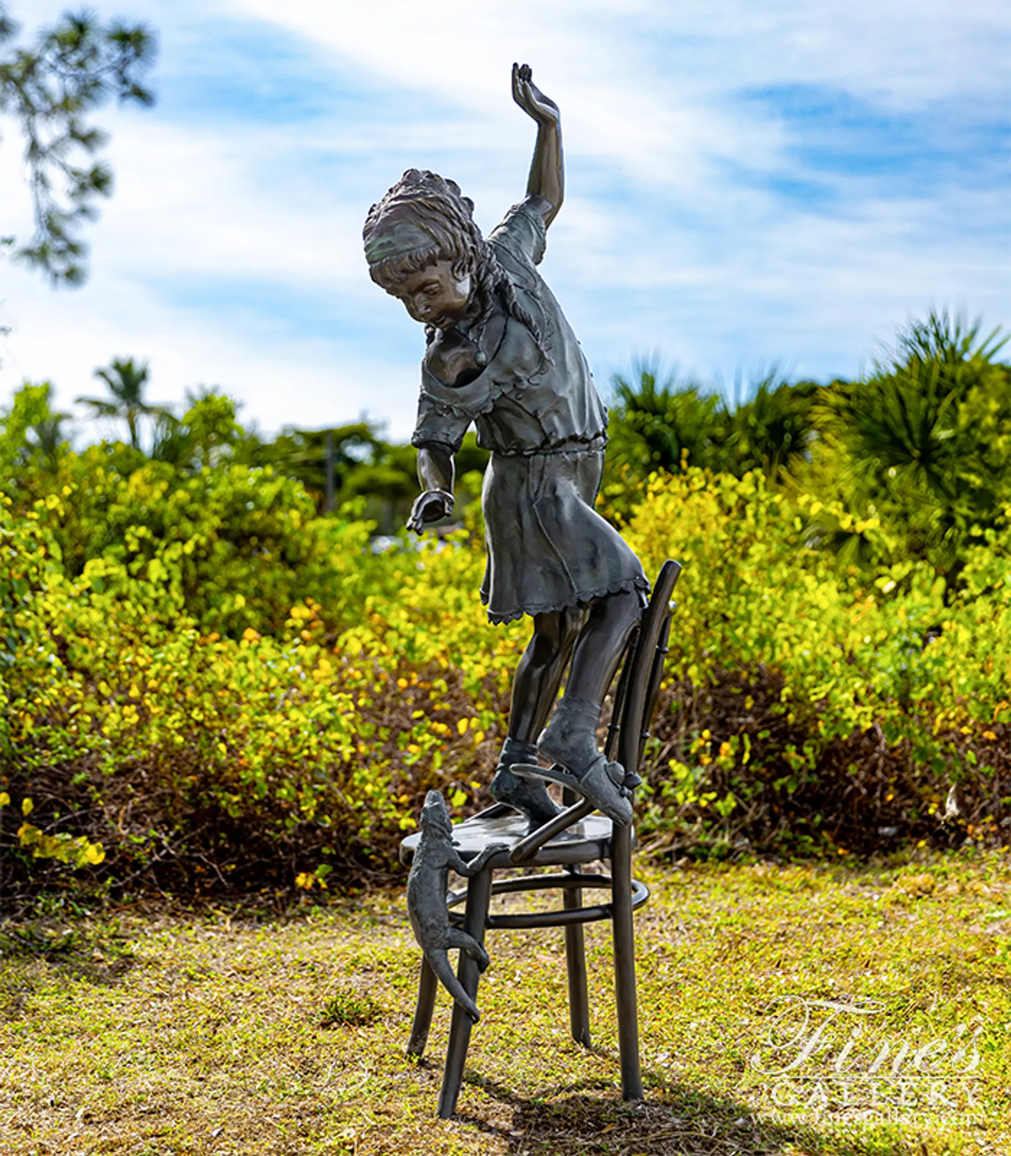 This statue shows a young girl that was caught by surprise at the sight of her little brothers chameleon. Afraid and startled, she jumps on a chair to try to get away only to have it follow her. A vintage bronze of 25 years of age, new unused condition.