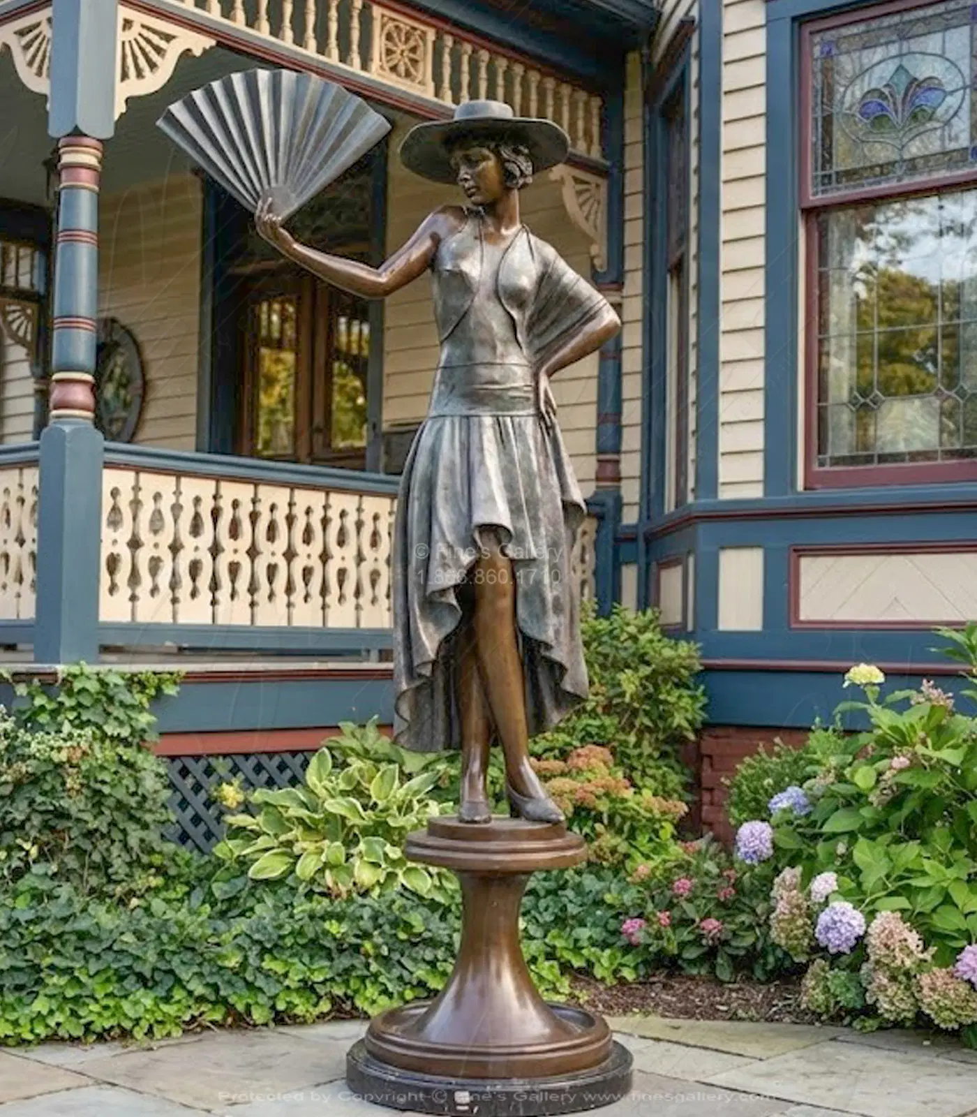 The sophisticated 1930s model, Sarah O Verton, fashions a classic summer sundress, large hat, and hand fan. This bronze statue is immaculately hand carved to depict the stunning elegance of her pose and stylish dress. A vintage piece of roughly 25 years.
