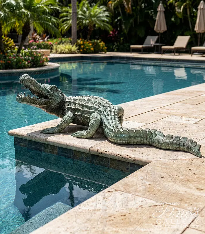 Beautifully crafted bronze alligator statue with authentic patina finish, expertly detailed to capture the reptile's natural features. This decorative bronze sculpture adds a touch of wildlife elegance to any home, garden, or office space. Handcrafted by skilled artisans, this durable outdoor-safe statue makes a striking conversation piece and perfect gift for nature enthusiasts. BS-1413.